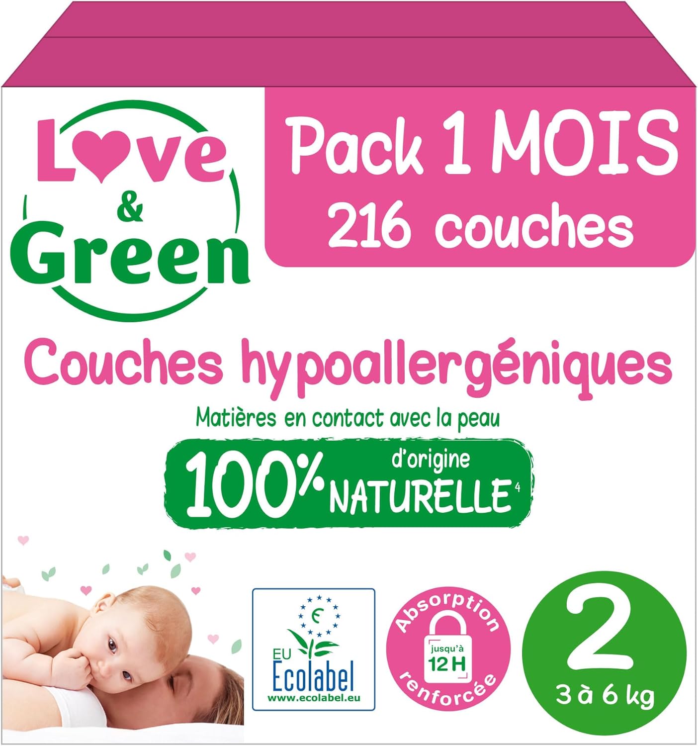 Love & Green Couches bébé taille 2 (3-6 kg) – Pack 1 mois de 216 couches, absorbantes et écologiques