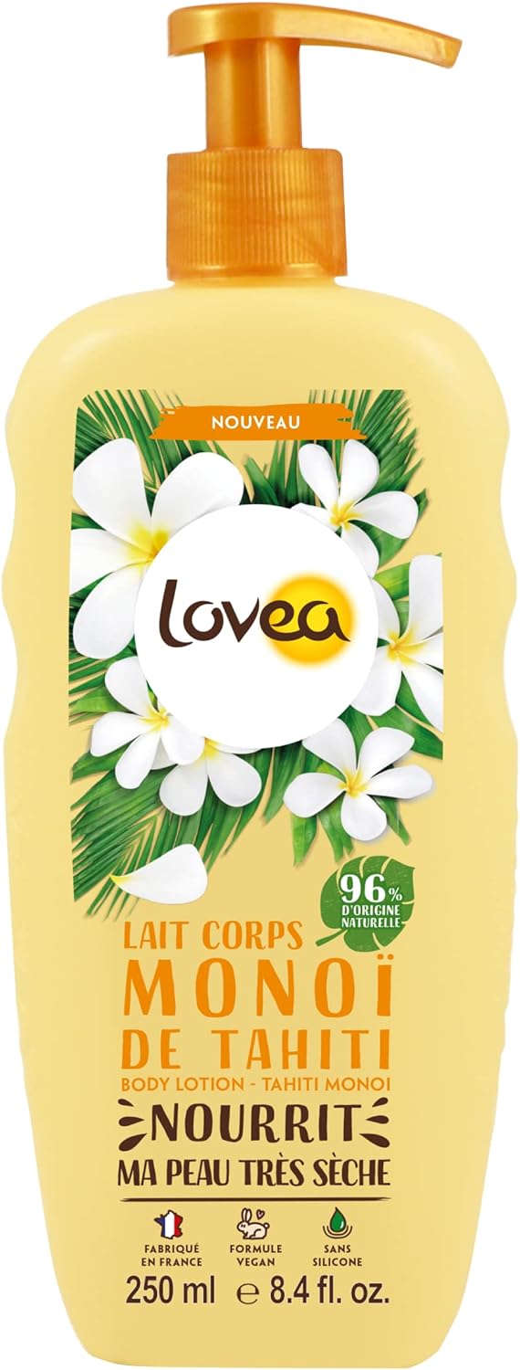 Lovea Lait Corps Monoï de Tahiti – Nourrit & Adoucit (peaux très sèches), 96% d’origine naturelle, sans silicone, vegan, fabriqué en France
