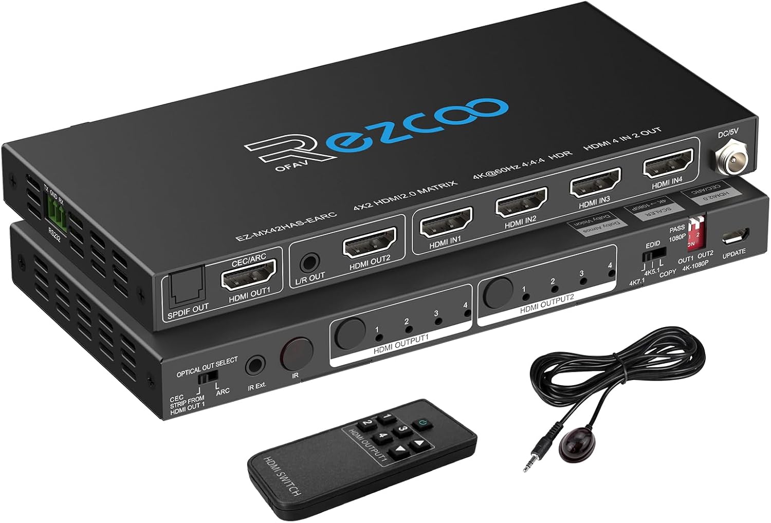 Ce qui fait l’intérêt de cette matrice HDMI 4x2, c’est la combinaison de plusieurs fonctions qui vont ensemble : - Gestion EDID : la fiche indique un “passage EDID” (attention, on n’est pas sur de la création EDID selon le détail fourni), ce qui peut aider à stabiliser la négociation vidéo/TV. - Audio via S/PDIF optique ou sortie stéréo jack : utile si tu veux envoyer le son vers une barre de son compatible optique, ou vers un système stéréo. - Prise en charge ARC (selon réglage) : la sortie HDMI 1 est annoncée compatible avec CEC ARC, avec un réglage à respecter côté “sélection de sortie optique” (il faudra faire attention à la configuration indiquée). - Commandes incluses : télécommande IR, contrôle via panneau, et mention d’un contrôle RS232.