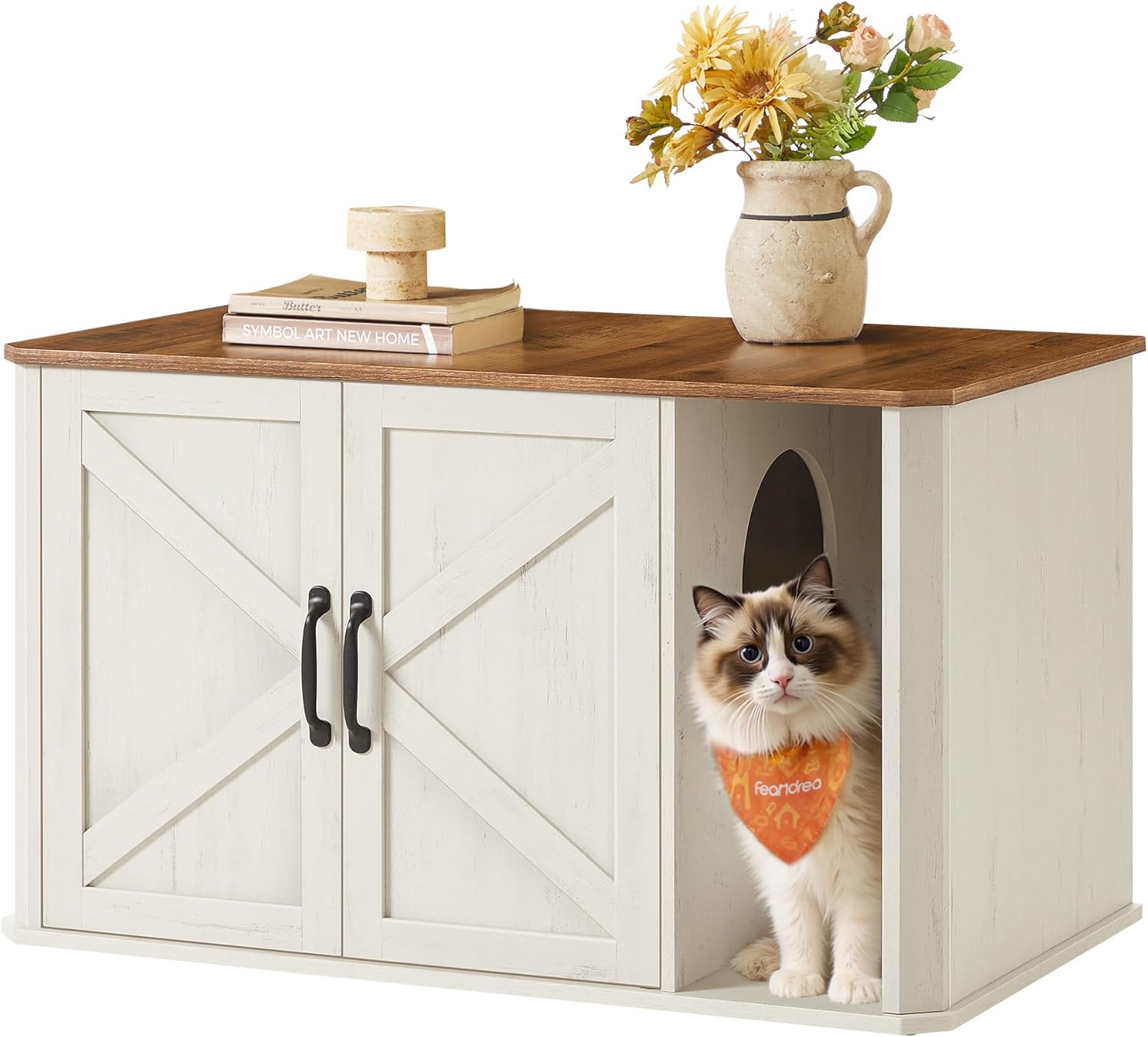 Ce modèle mise aussi sur l’intégration déco. Sa finition marron miel et blanc rustique est conçue pour s’accorder à des intérieurs déjà “meublés”, plutôt que de faire un bloc technique isolé dans un coin. Le résultat dépend forcément de votre aménagement, mais l’intention est là : rendre la litière moins “brute” et plus compatible avec une entrée, un couloir ou une pièce de vie.