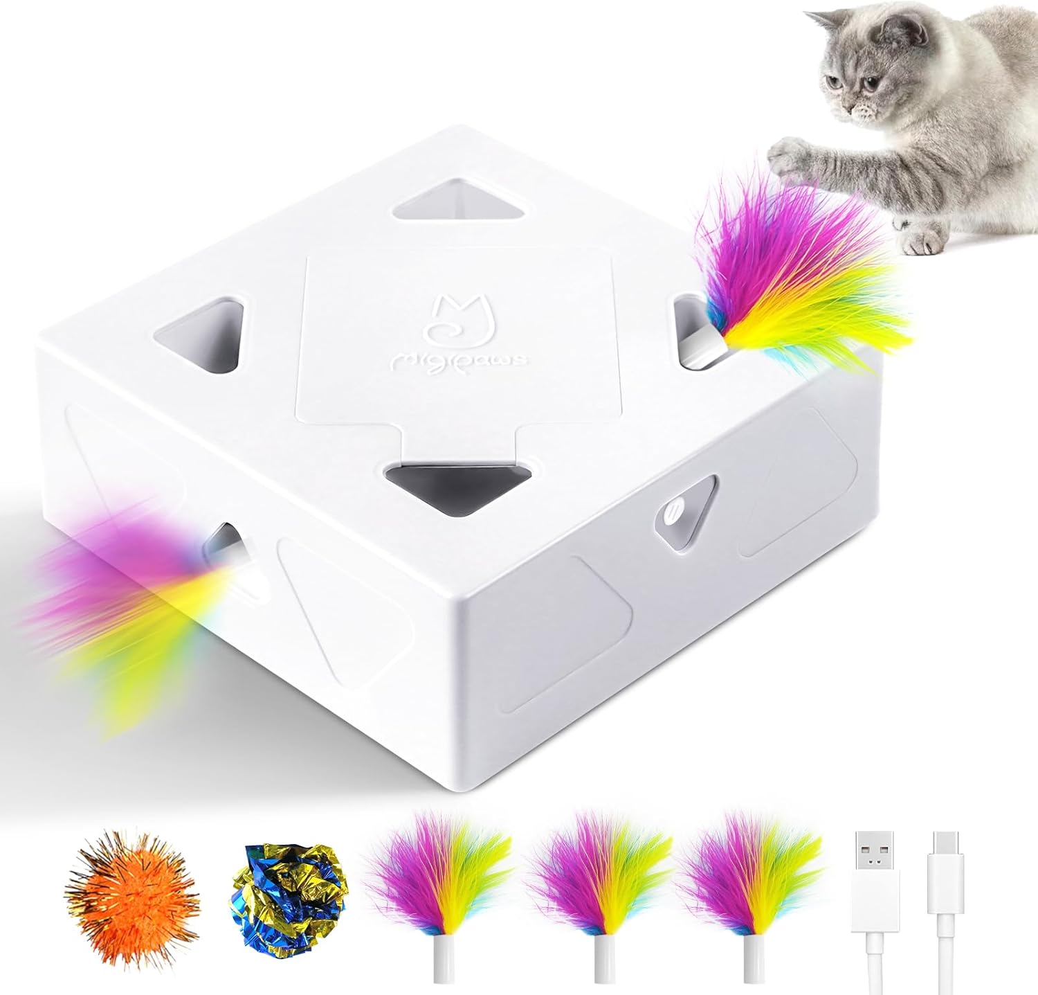 Migipaws Jouet pour Chat à 7 trous interactif automatique, rechargeable USB (4 plumes)