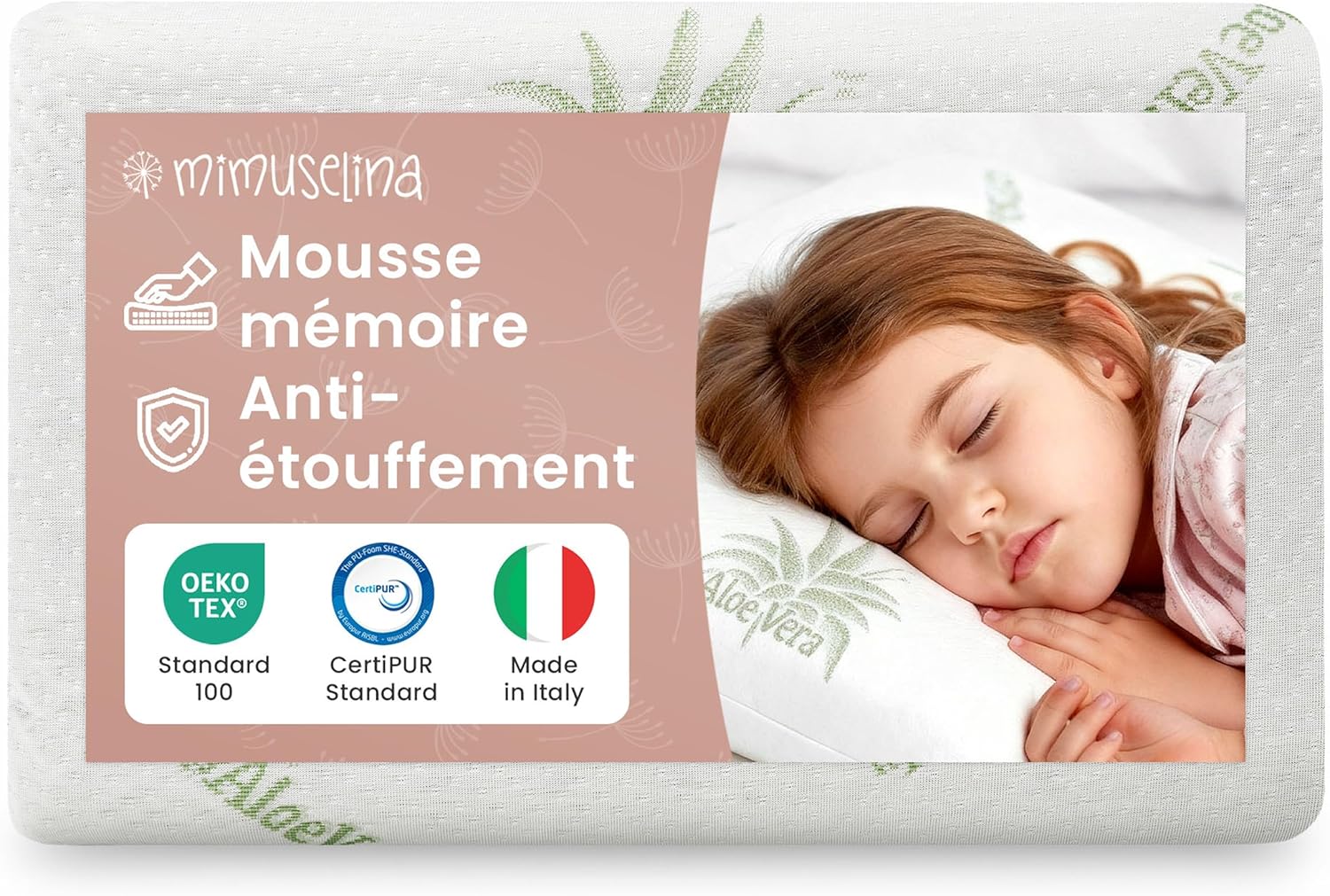 MIMUSELINA Oreiller mémoire de forme 50x30x5,5 cm pour bébé et enfant avec housse Aloe Vera amovible