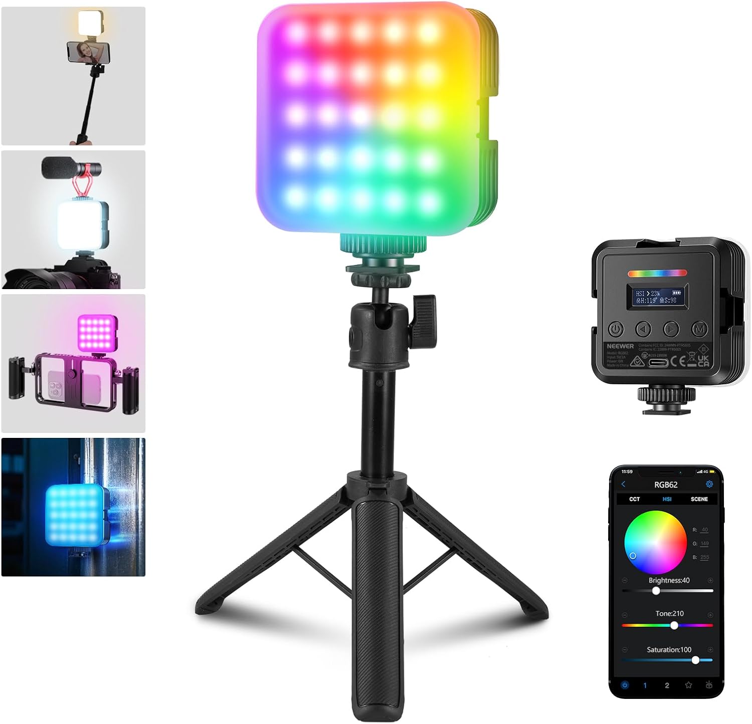 NEEWER Lampe vidéo magnétique RVB RGB62 compacte (contrôle via application, trépied de bureau, CRI97+)