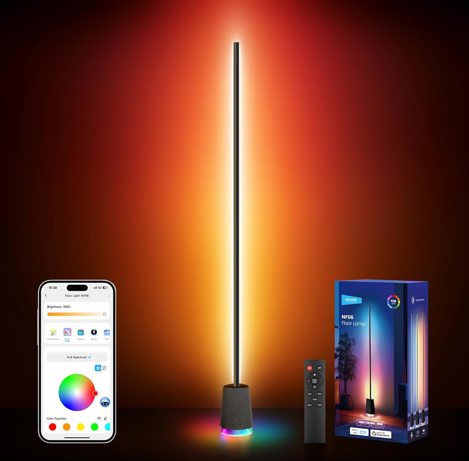 Le NEEWER NF06 est un lampadaire intelligent LED RGBCW conçu pour transformer l’ambiance d’une pièce sans passer par des réglages compliqués. Sur le papier, il coche plusieurs cases qui comptent au quotidien : un rendu lumineux annoncé jusqu’à 1500 lm, une large diffusion (angle de 180°), et surtout la personnalisation via application, télécommande et commandes vocales compatibles Google Assistant/amazon Alexa. Le format “lampadaire d’angle”/sur pied et sa hauteur de 165 cm en font un produit orienté décoration et scénarios d’éclairage.