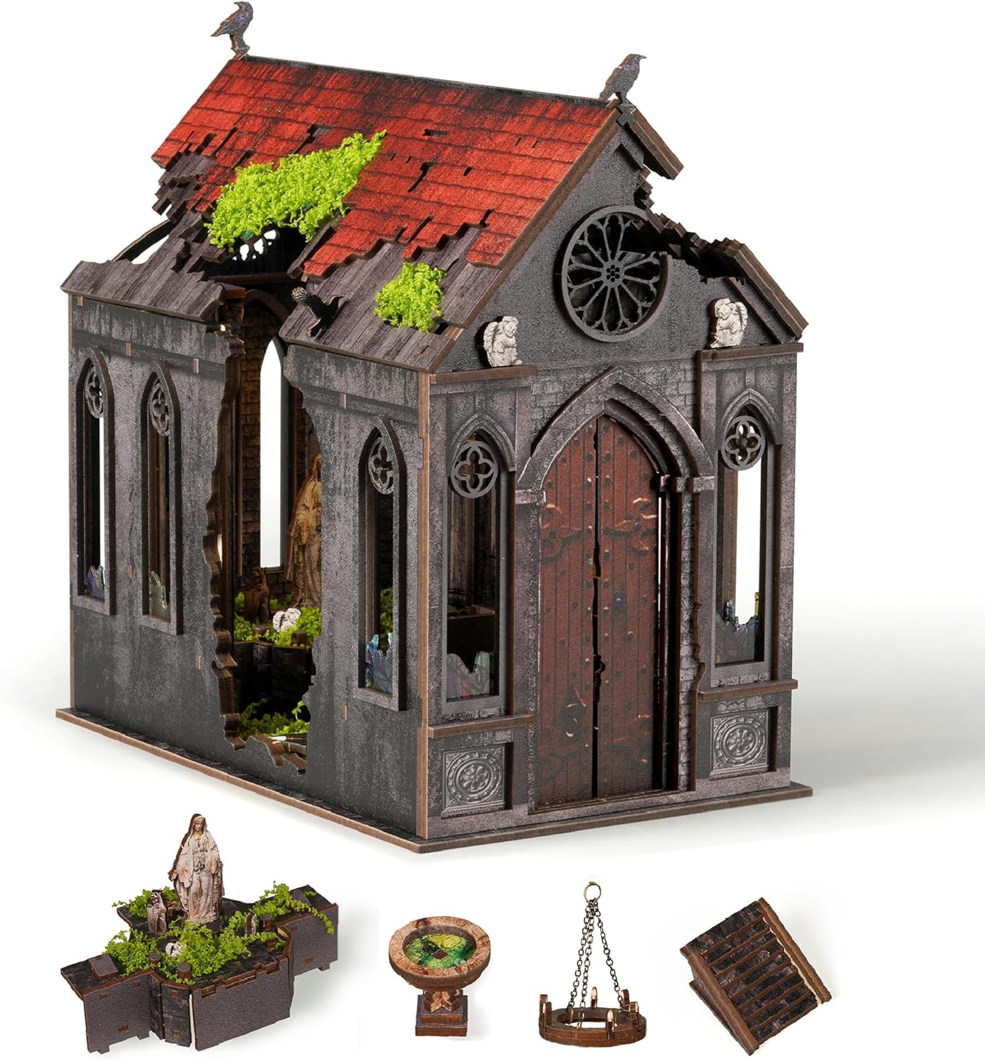 Le kit se présente comme un ensemble complet de modèle en bois détaillé, avec plus de 254 pièces de précision annoncées. Le thème est clairement gothique et immersif : on évoque des parois de pierre texturées et “vieillies”, ainsi que des symboles fins. Le résultat attendu n’est donc pas celui d’un décor abstrait, mais d’un diorama qui donne l’impression d’un lieu, avec des surfaces travaillées et un style “mystère”.