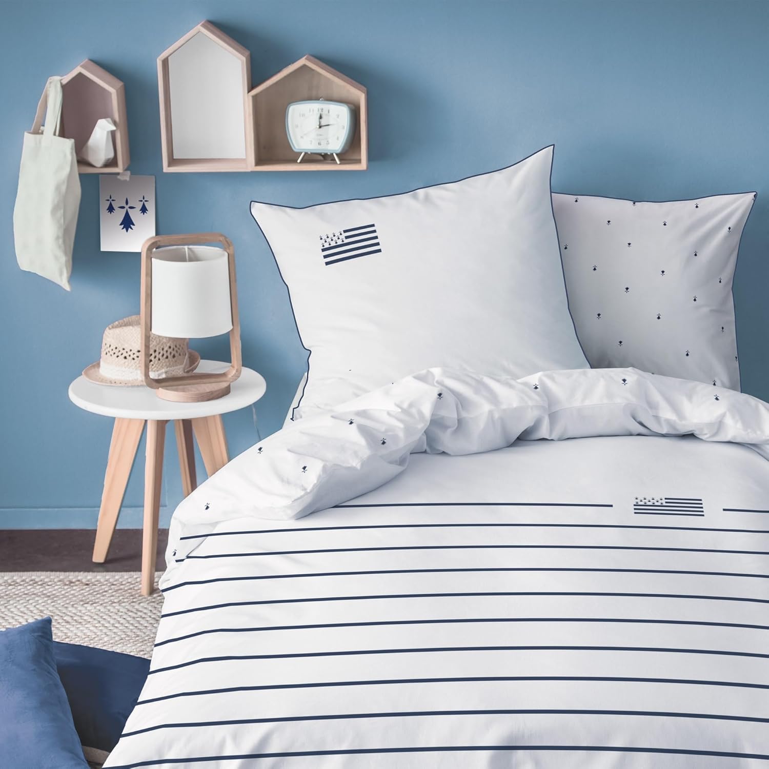 La parure de lit MATT & ROSE Gwenn Ha Du est pensée pour apporter du confort au quotidien, avec une matière simple et appréciée : le 100% coton. Elle est fournie pour un couchage de 140x200 cm, avec une housse de couette et une taie d’oreiller 63x63 cm. Le ton « blanc » et le style breton réversible donnent aussi un vrai côté décoratif : tu peux changer l’ambiance en un clin d’œil selon le côté de ta housse.