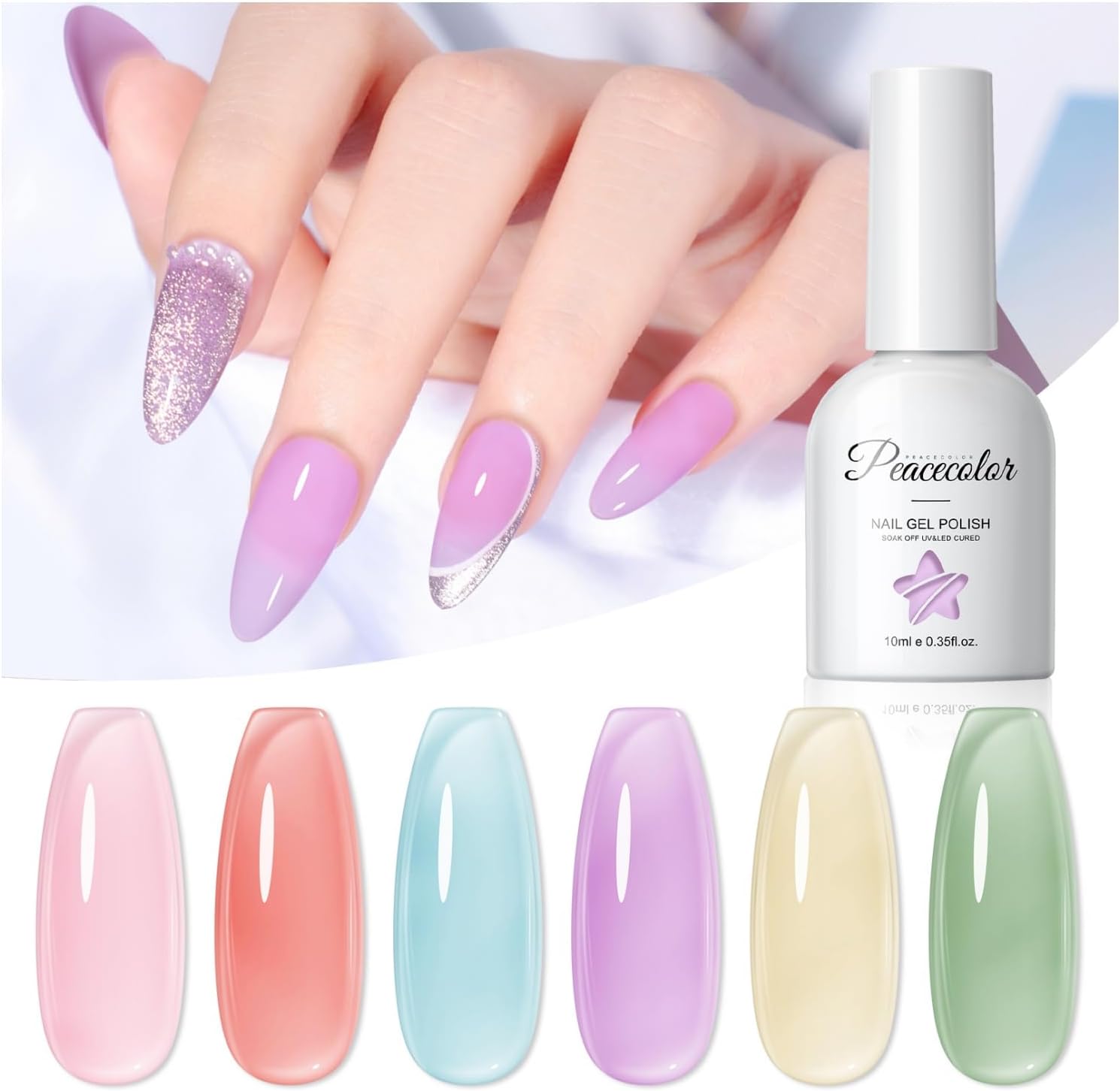 PEACECOLOR Vernis semi permanent Jelly – kit de 6 couleurs transparentes (rose, jaune, vert, bleu, violet, lila)