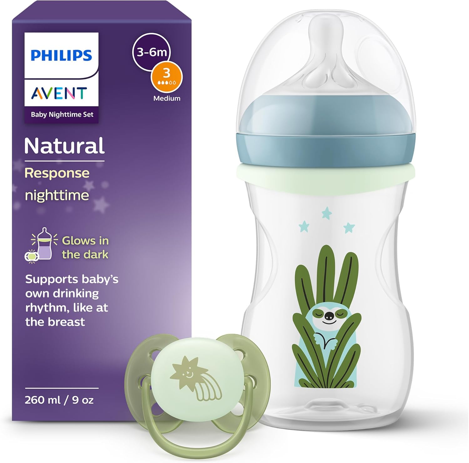 Ce Philips Avent Natural Response Pack nuit mérite clairement votre attention si vous cherchez un biberon avec tétine à réponse naturelle, afin que le lait s’écoule uniquement quand bébé tète activement, avec un débit moyen (3) adapté au rythme de votre enfant. L’anneau phosphorescent et la sucette nuit ajoutent un vrai confort pour la routine du soir.