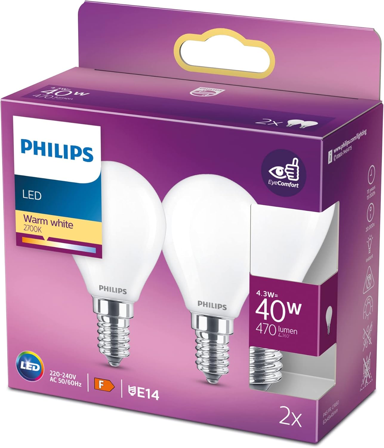 - Nom: Philips Lot de 2 ampoules LED Classic E14