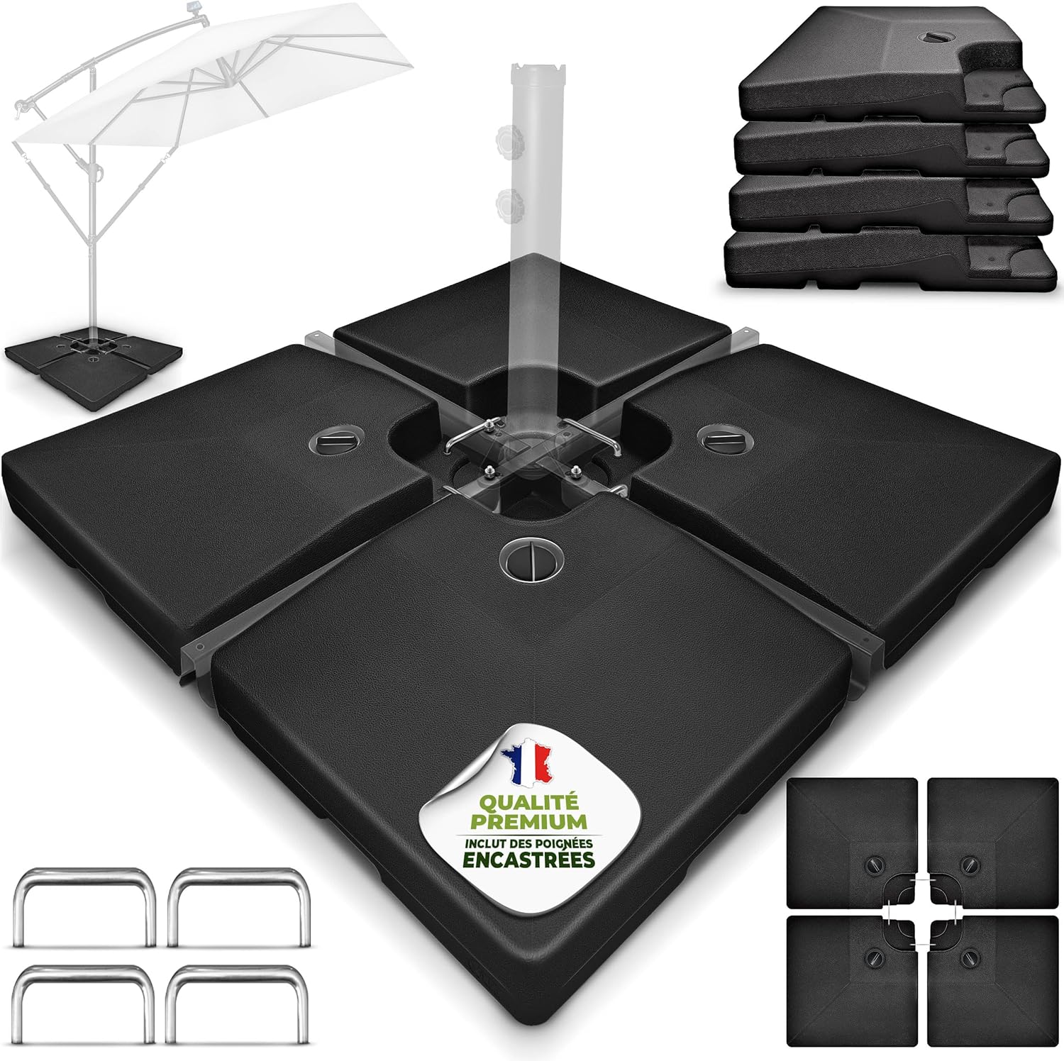 - Pied de parasol déporté tillvex – 4 dalles carrées lestables 60 L ou 80 kg, avec connecteur métallique (noir)
