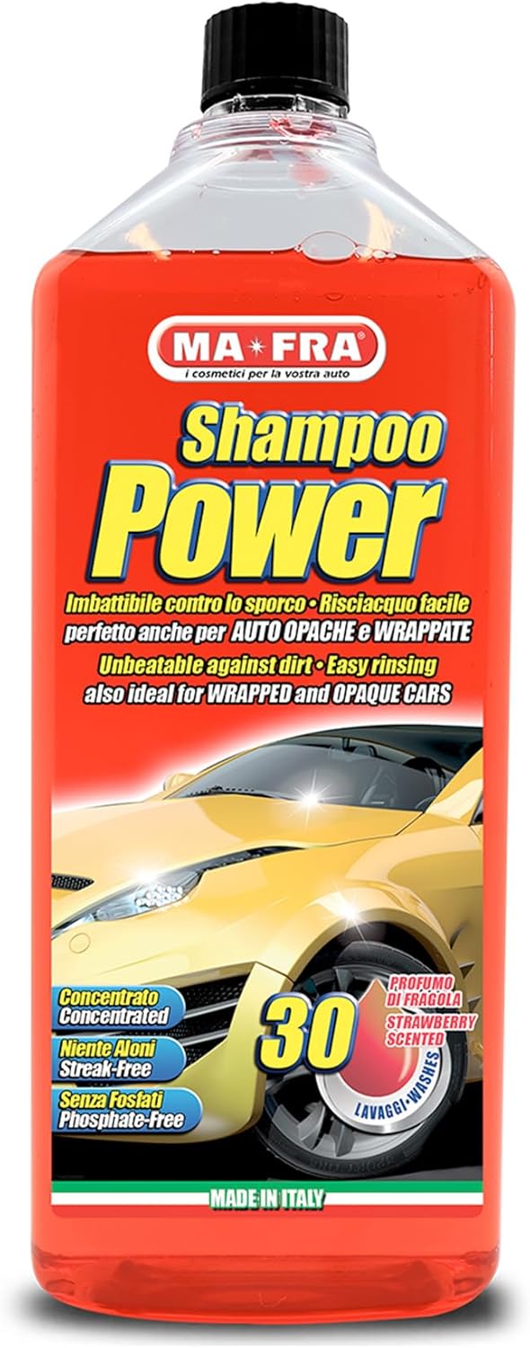 Produit: Mafra Power Shampoo. Type: Nettoyant automobile dégraissant concentré. Contenance: 1000 ml. Usage: véhicule, adapté pour phares, surfaces mates et films d’enveloppement, formulation à faible résidu après rinçage. Sécurité: conçu pour être sûr sur peintures mates et satinées, ainsi que sur des pièces traitées comme les profiles en aluminium et les jantes émaillées. Concentré: permet de réaliser jusqu’à 30 lavages selon la dilution et la méthode d’application.