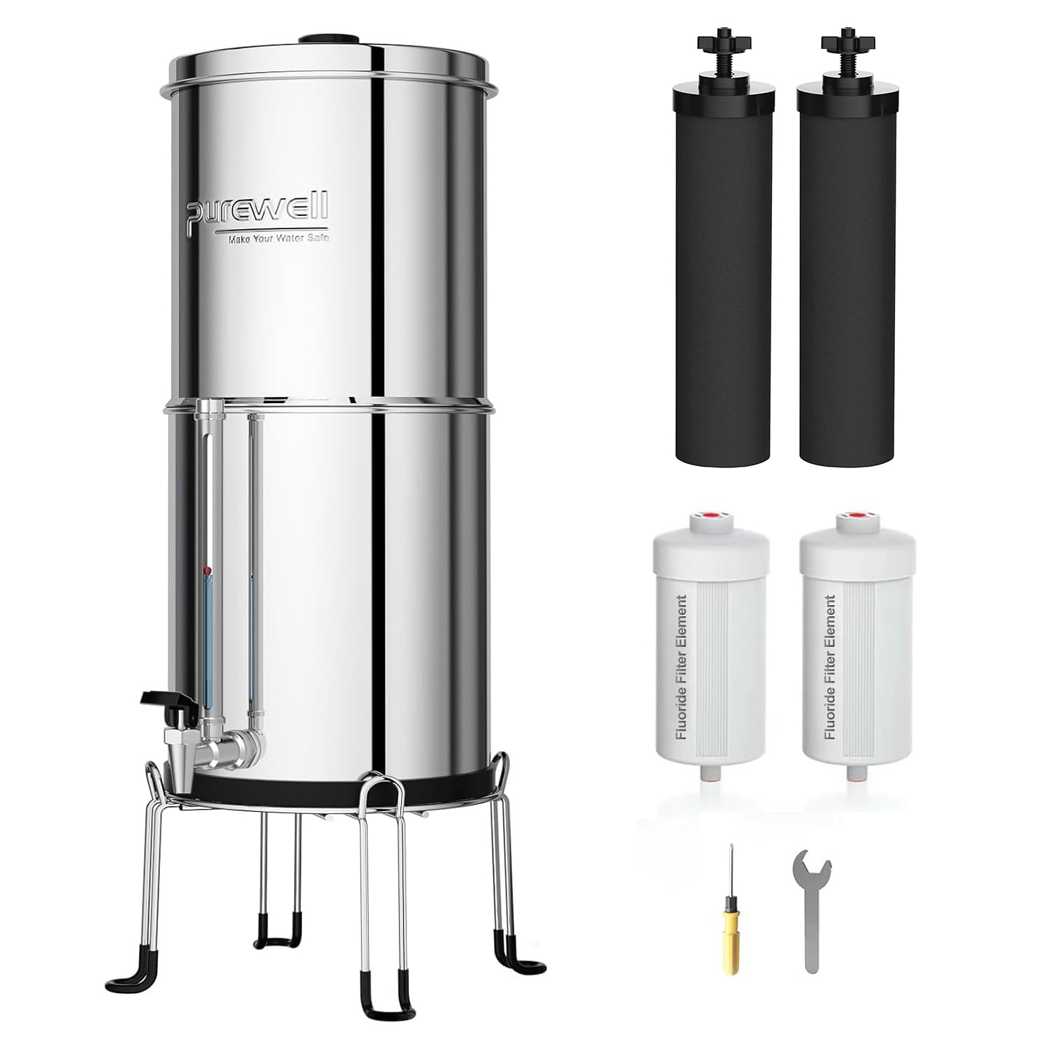 Purewell Filtre à Eau Gravity 8,5 L – Cuve Inox 304 et 4 Filtres (Charbon/Fluor) sans électricité