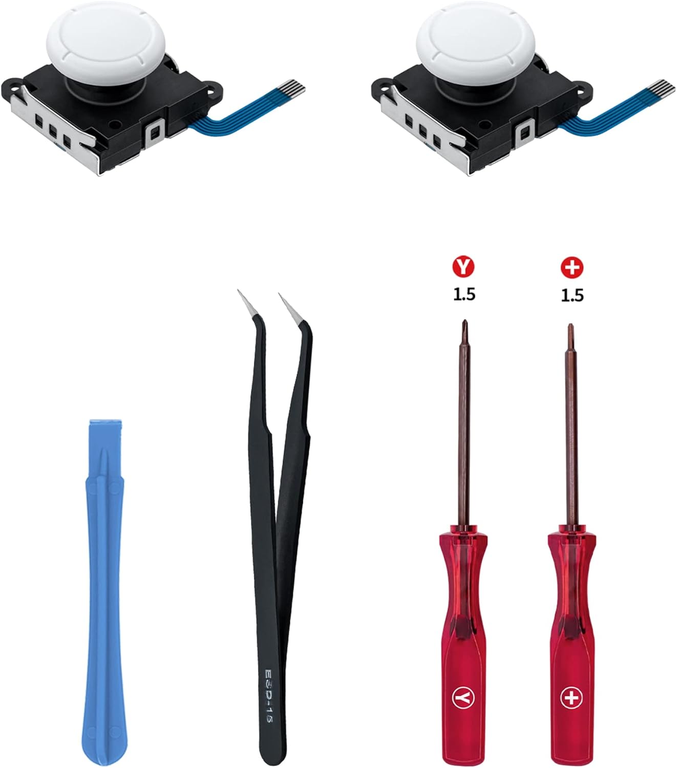 Le kit comprend : - 2 x joysticks analogiques 3D de rechange - 1 x tournevis “Y” (Triwing) - 1 x tournevis “+” - 1 x outil d’ouverture - 1 x pince à épiler
