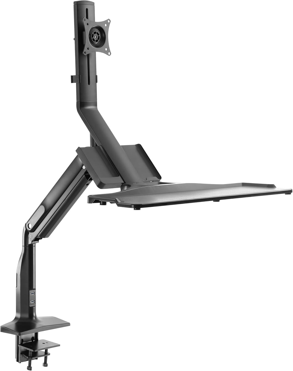 Un support d’écran avec bras permet surtout deux choses : gagner de la place sur le bureau et améliorer l’ergonomie au quotidien. Le RICOO TS5411 est pensé pour accueillir un écran de 17 à 32" (en diagonale approximative 43 à 81 cm) tout en intégrant un plateau pour clavier et souris. Sur le papier, c’est une approche assez complète : on ajuste la hauteur via un mécanisme à ressort, on peut orienter et incliner l’écran, et on ajoute un espace dédié pour les périphériques.