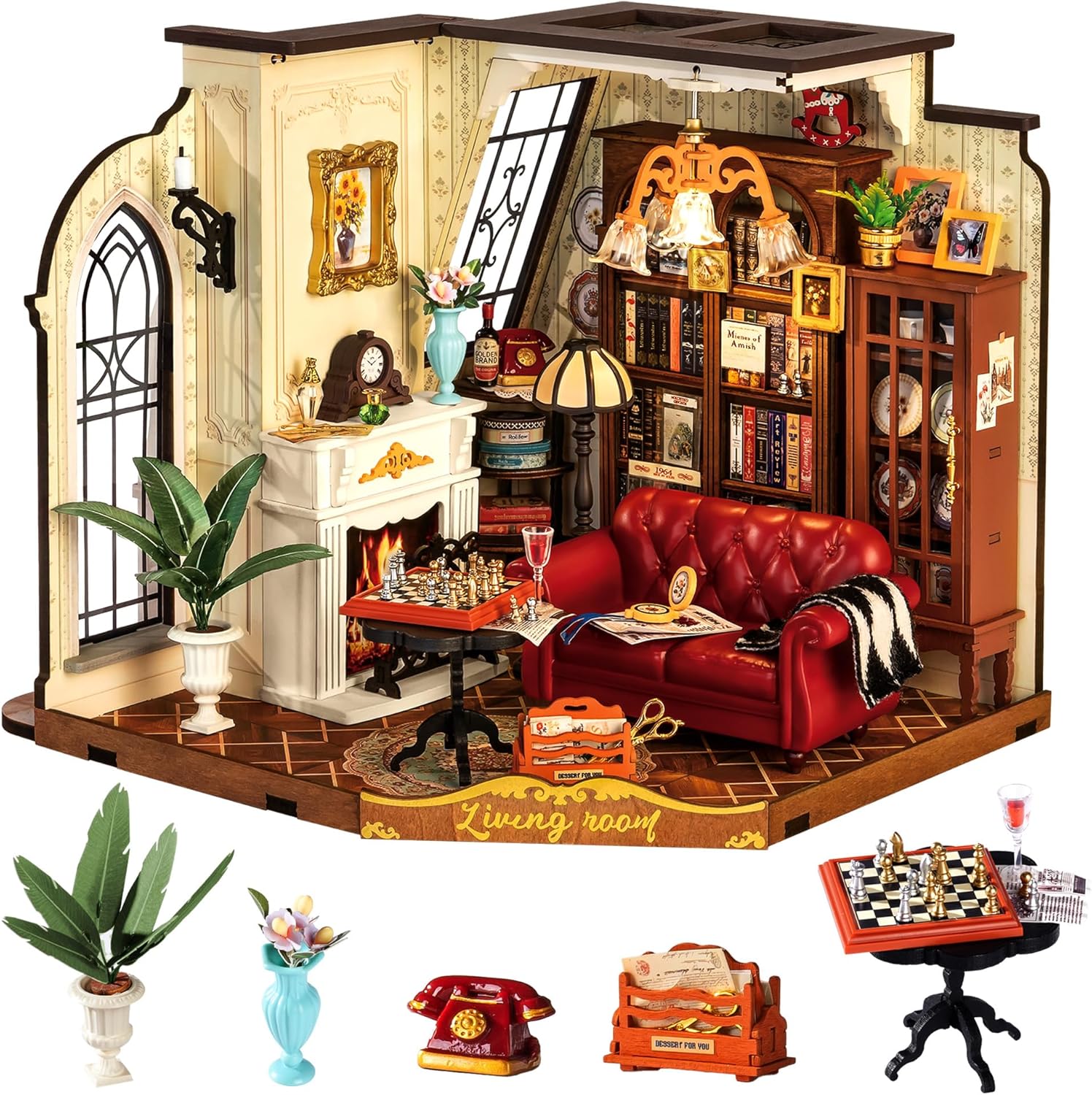Ce qui impressionne ici, c’est la cohérence de la scène. Les détails annoncés ne sont pas juste décoratifs “au hasard” : les fenêtres avec verre ornementé, les marquages dorés, la cheminée, les plantes et les objets vintage finissent par créer un salon chaleureux. L’idée est que, une fois assemblé, le modèle ne reste pas un simple objet de vitrine.