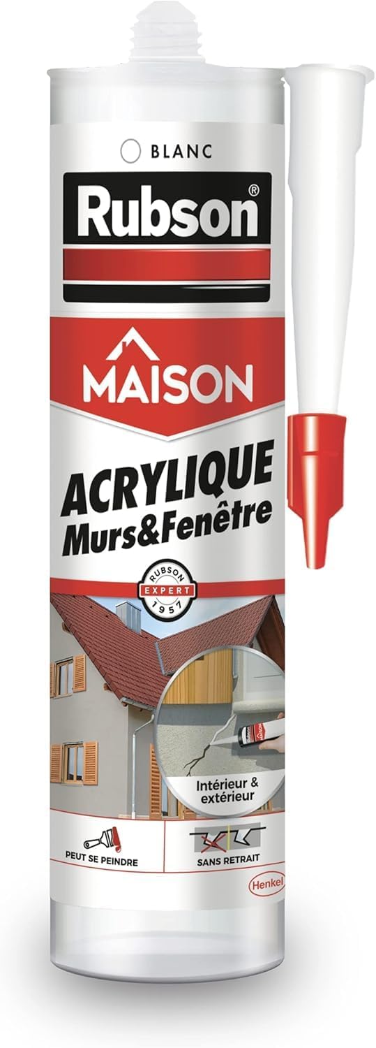 Le Rubson Mastic Maison Acrylique Murs & Fenêtres est un mastic acrylique blanc destiné à faire des joints et à combler des fissures, avec une logique simple : pouvoir travailler aussi bien à l’intérieur qu’à l’extérieur. Sur le papier, c’est le genre de produit qui rend service quand il faut faire des raccords autour d’une porte ou d’une fenêtre, ou reprendre une jonction entre maçonnerie et éléments de menuiserie.