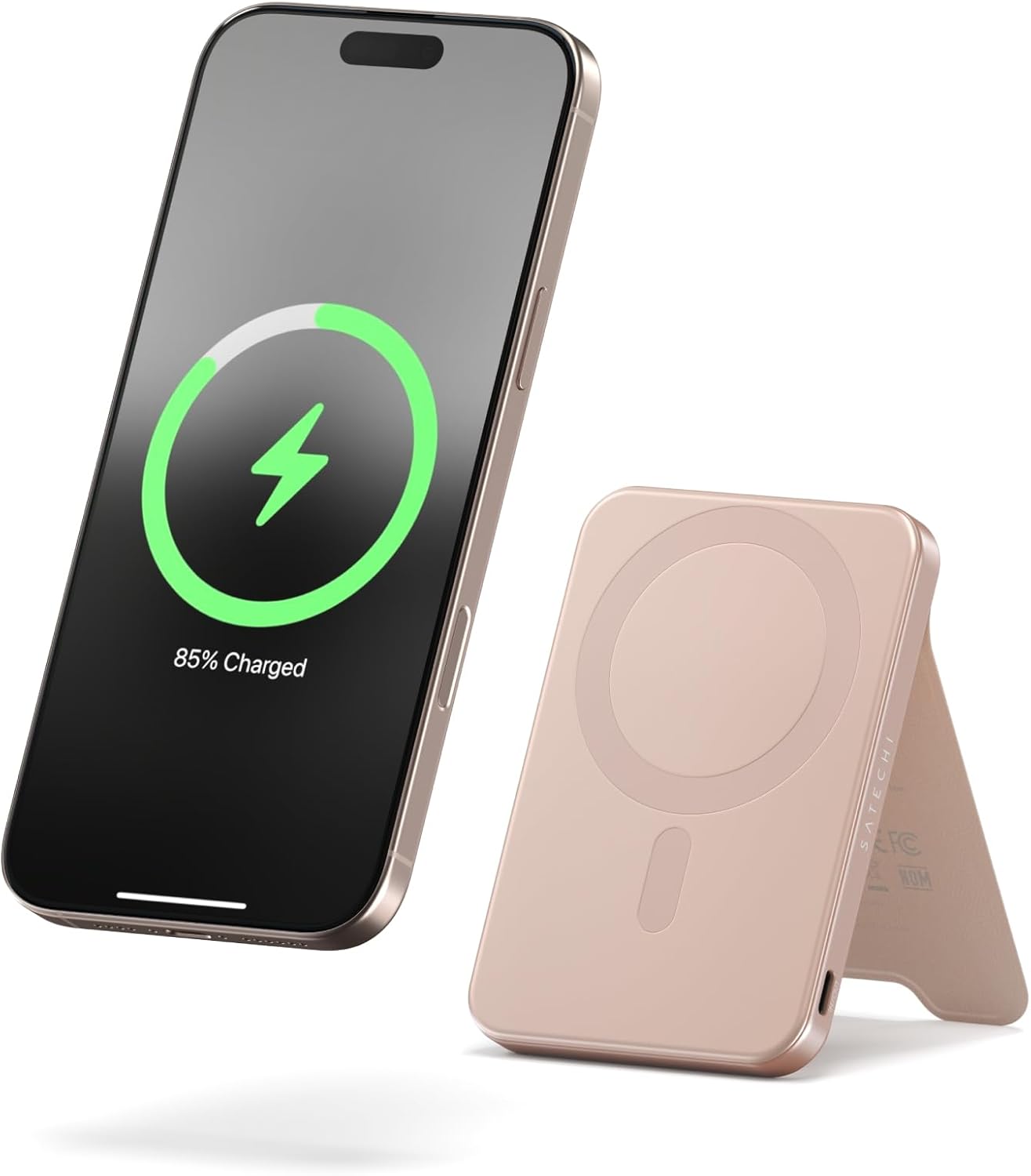 SATECHI OntheGo™ Batterie Externe MagSafe 5000 mAh Qi2 avec support pliable (rose) — charge rapide jusqu’à 15 W