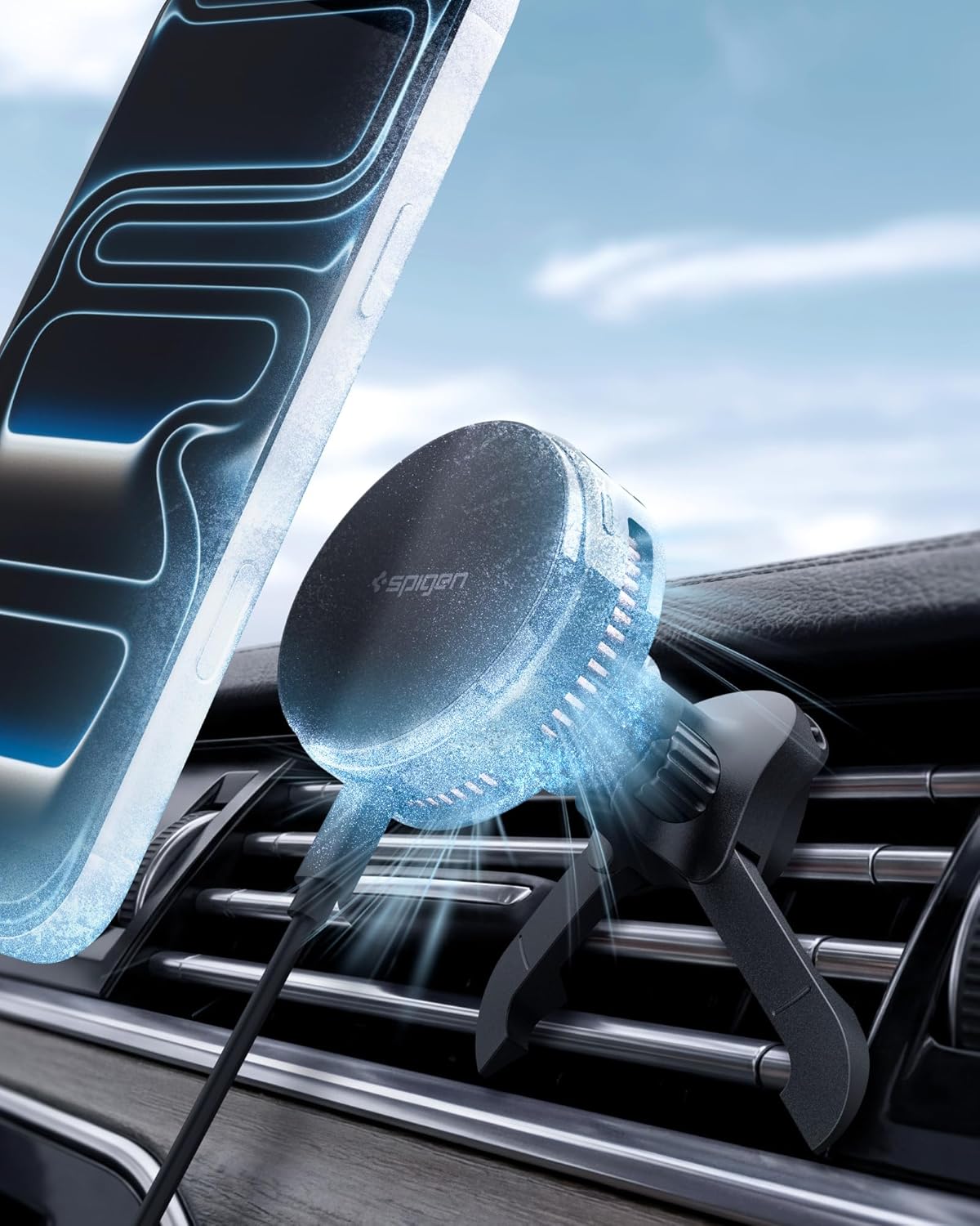 Spigen Essential CryoMax MagFit Qi2.2 25W chargeur voiture MagSafe avec refroidissement Peltier