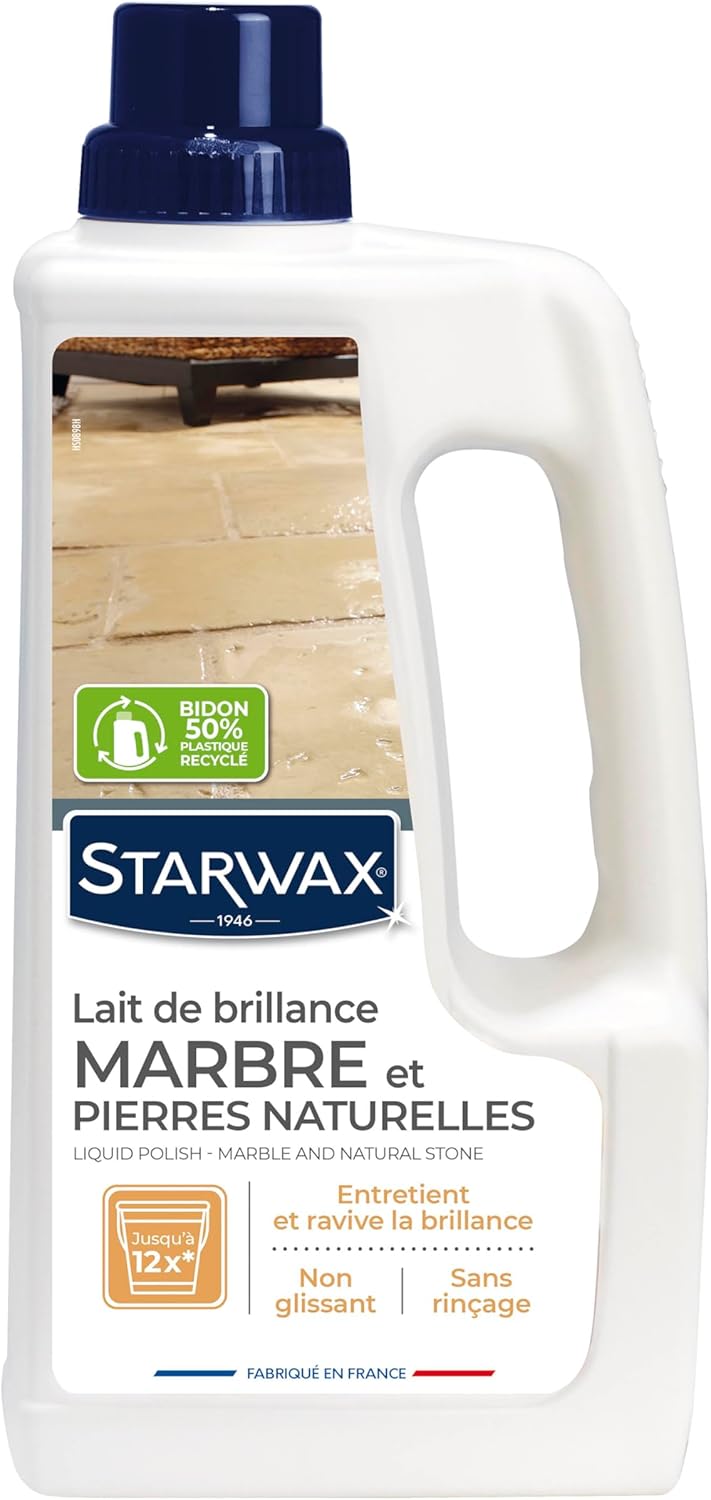 Le STARWAX Lait de Brillance est un lait d’entretien pensé pour nettoyer et raviver l’aspect des sols en marbre et en pierres naturelles. Sur le papier, l’idée est simple : redonner un coup de propre et une brillance plus marquée, tout en renforçant l’effet protecteur quand on utilise, en complément, un rénovateur protecteur brillant pour marbre et pierres naturelles.