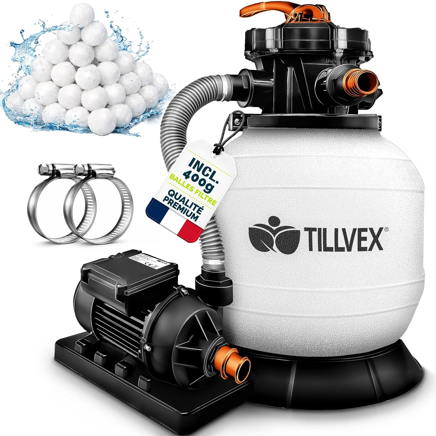 - Nom : tillvex® Système de Filtre à Sable 7.900L/h + 400g Boules de Filtre | 7 Fonctions de Filtration & Adaptateur 2en1 Ø32-38mm