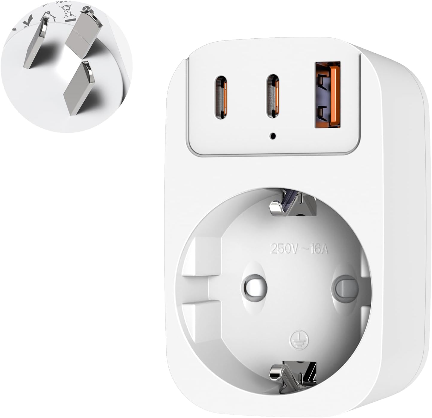 La promesse de ce modèle, c’est la charge simultanée. L’adaptateur intègre : - une prise Schuko/extension de type “adaptateur voyage” pour correspondre au contexte Australie mentionné, - un port USB A annoncé avec charge rapide 5 V et 2,4 A, - deux ports USB-C annoncés avec charge rapide 5 V et 3 A,