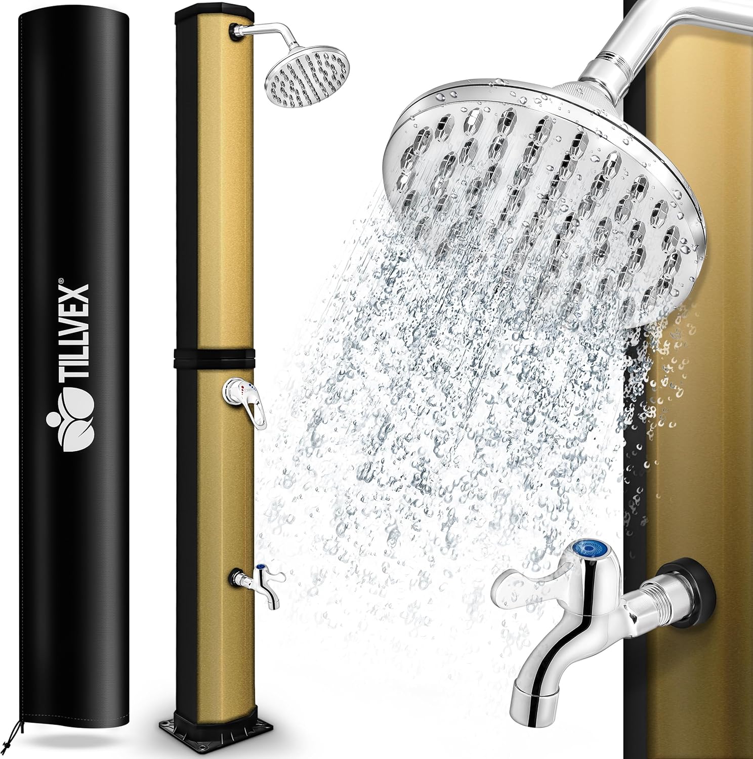 La douche solaire tillvex 35 litres offre une solution simple et autonome pour se rincer en extérieur sans raccordement électrique. Idéale au jardin, au bord de la piscine ou au camping, elle chauffe l'eau grâce à l'énergie solaire jusqu'à 60 ° selon fabricant, pour un compromis pratique entre confort et respect de l'environnement. Le capot de protection et le design haut de 215 cm facilitent l'usage pour toutes les tailles de corps, tandis que le montage se fait rapidement par un raccord vissé au sol.