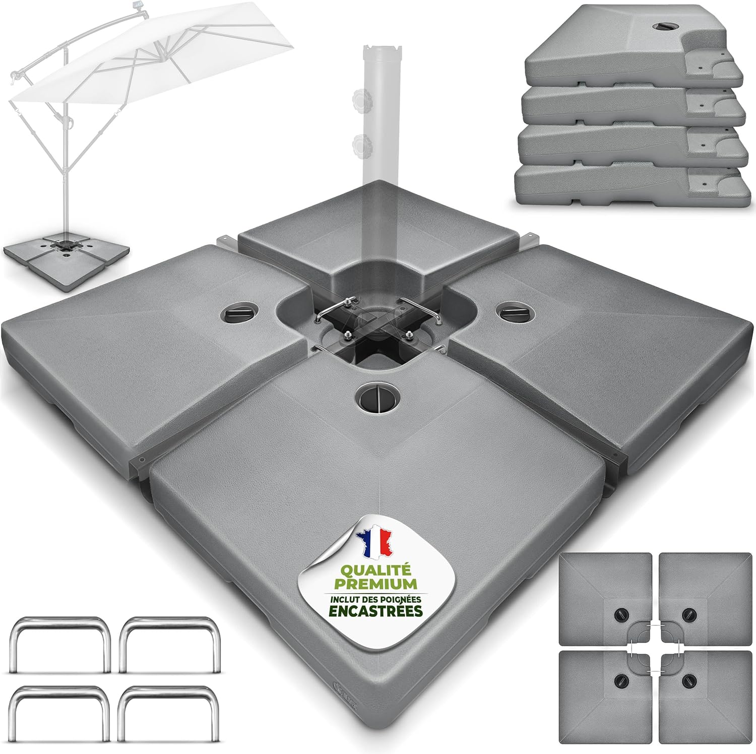 Le design compact se compose de quatre dalles carrées empilables avec connecteur métallique pour une fixation sûre. Fabriqué en plastique HDPE résistant aux UV et aux intempéries, l’ensemble conserve sa forme et sa fonctionnalité au fil des saisons. Grâce aux poignées intégrées, le déplacement et la manipulation restent pratiques même après remplissage. Pour les zones ventées ou les parasols de grande taille, la capacité de charge annoncée par le fabricant garantit une stabilité accrue.