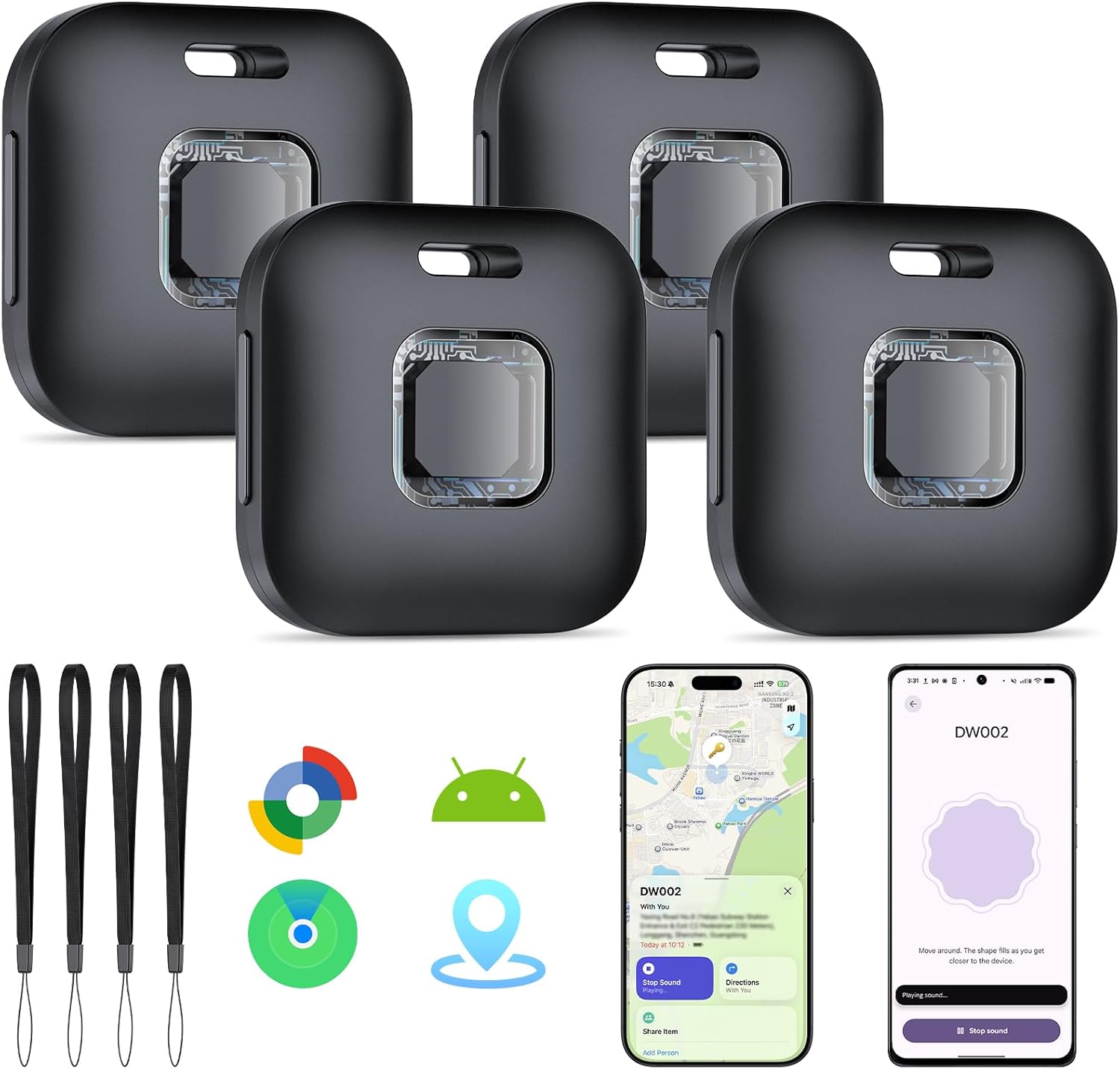 Tracker Tags DW002 certifié Apple et Google, lot de 4 noir (Bluetooth Smart Tag pour Apple Localiser & Google Find Hub)