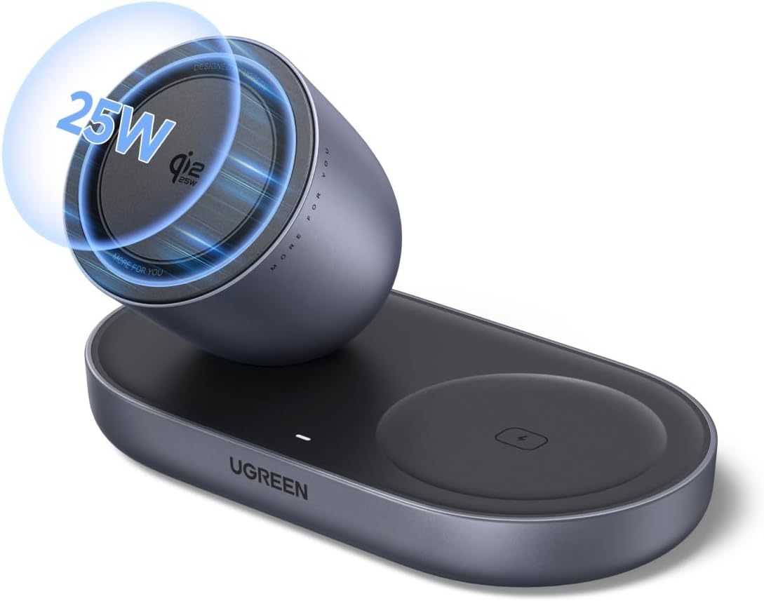 Ce chargeur induction Qi2 25W UGREEN Zapix vaut le coup si tu veux une station 2 en 1 discrète et pratique pour recharger ton iPhone compatible MagSafe et tes AirPods au même endroit, avec des protections de sécurité clairement annoncées et une fixation magnétique pensée pour stabiliser la charge.