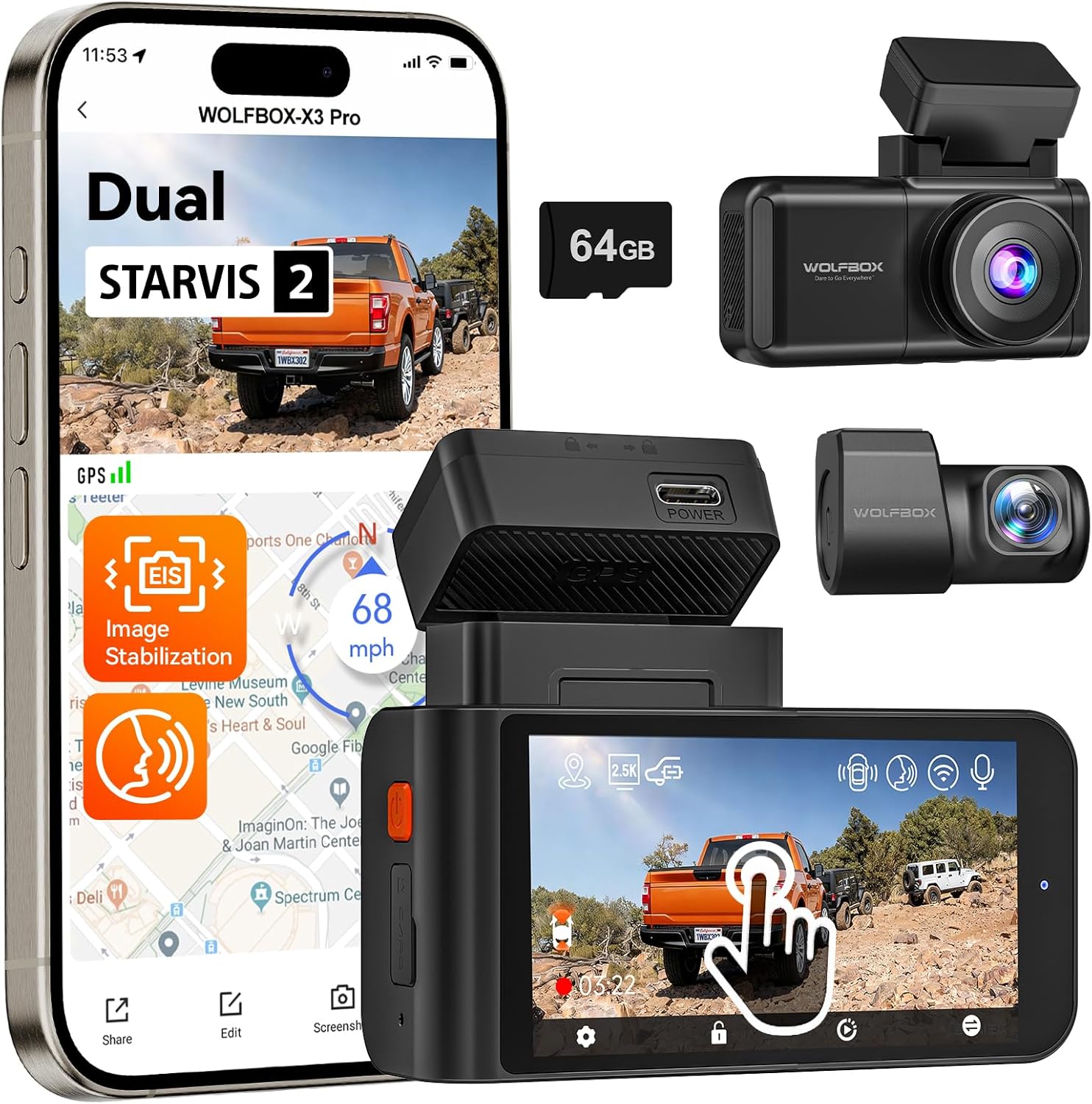 - WOLFBOX Starvis 2 IMX678 (X5) – Caméra de voiture 3 canaux 4K+2,5K+1080P avec GPS, Wi‑Fi 5,8 GHz et commande vocale