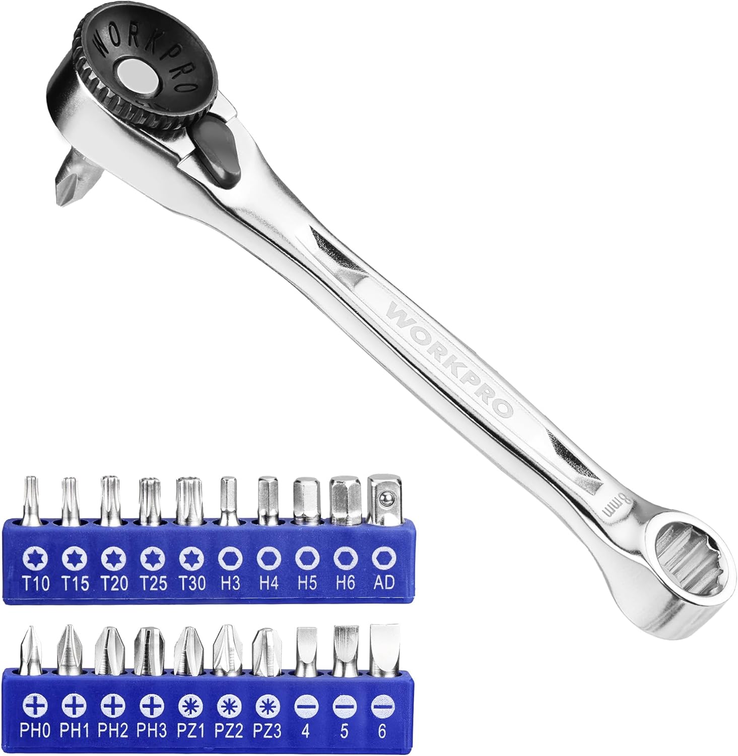 WORKPRO Mini clé à cliquet double tête 1/4" avec 20 embouts et mécanisme 72 dents (105 mm)