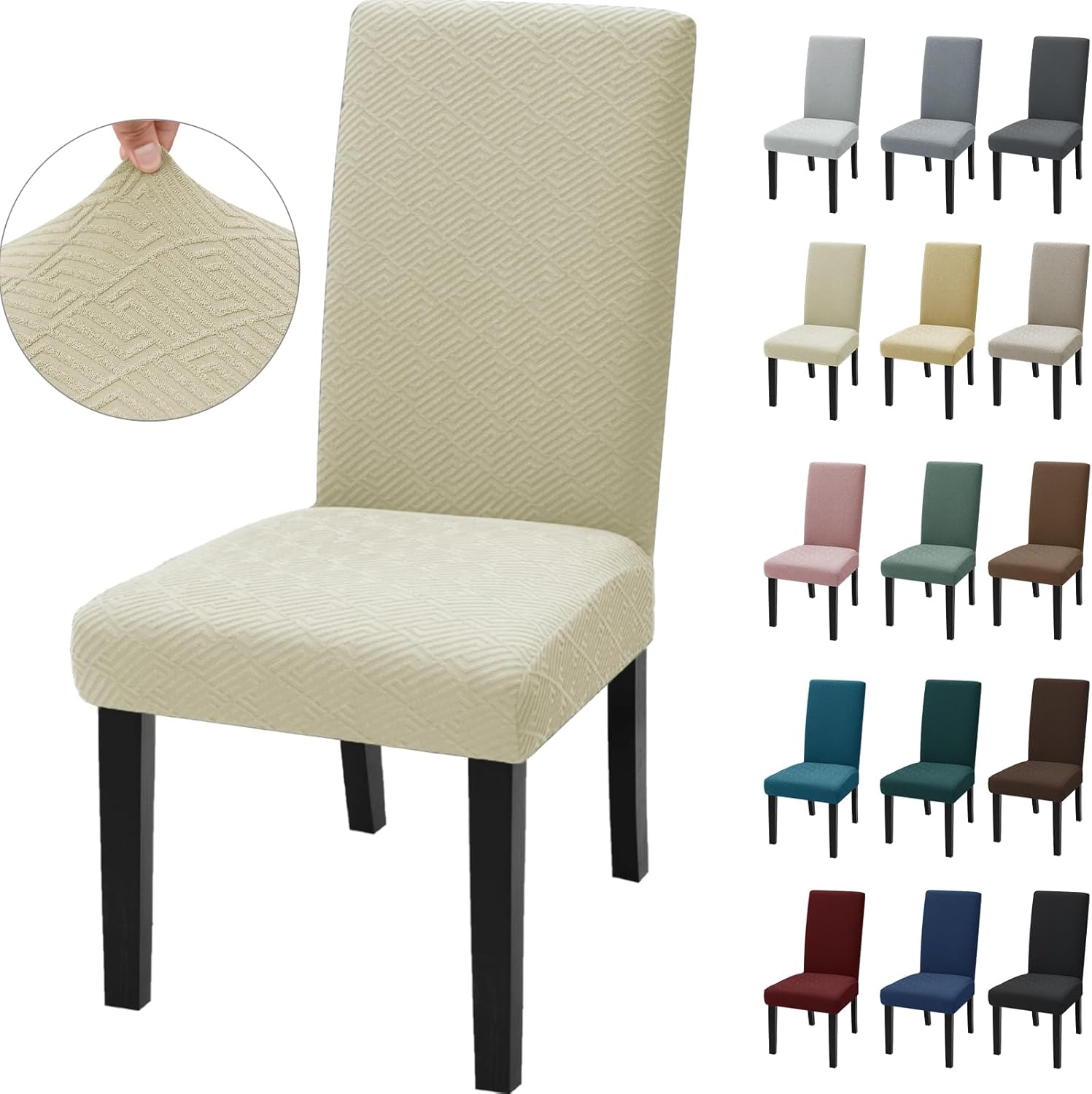 La housse est fabriquée dans un mélange de 92 % polyester et 8 % spandex, ce qui la rend à la fois souple et résistante. Selon le fabricant, le tissu est anti‑boulochage, infroissable et respirant. Elle enveloppe complètement la chaise pour éviter taches et rayures, et elle convient dans un cadre formel comme informel, que ce soit au restaurant, en réunion ou dans un salon.