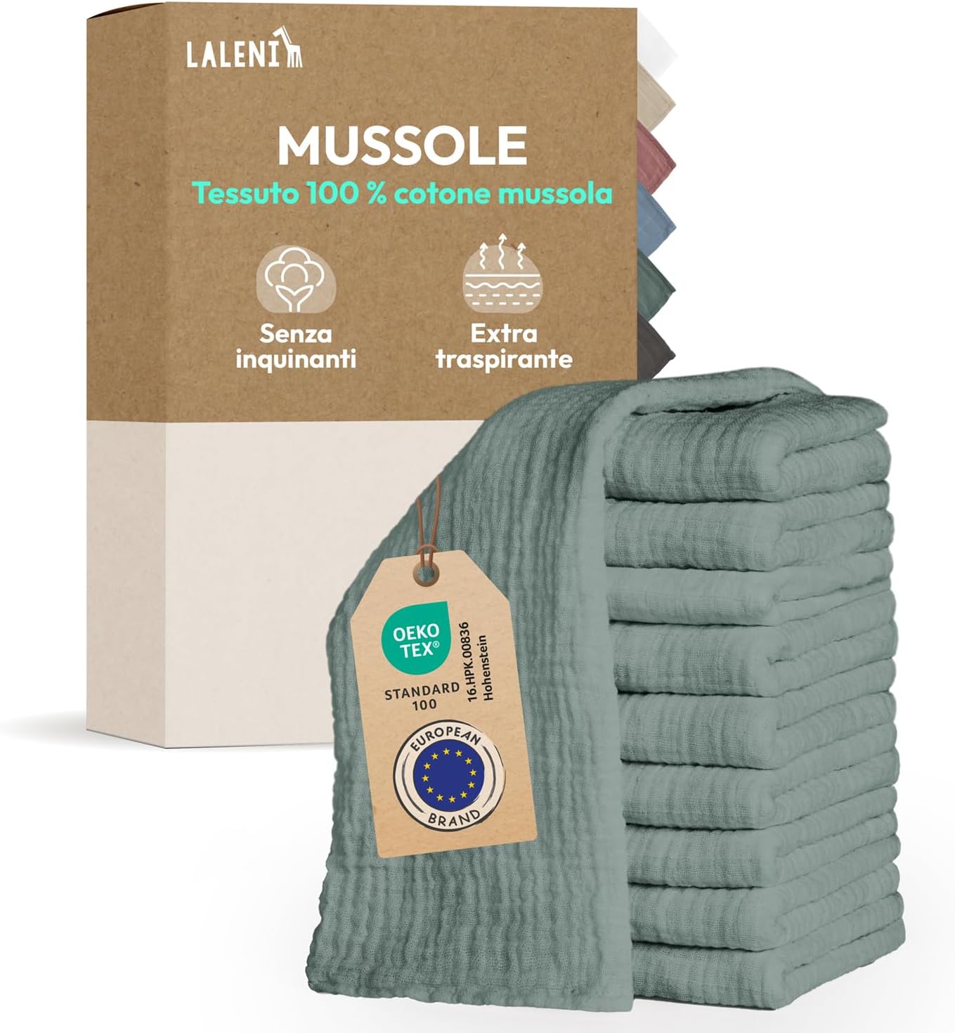 Laleni Mussole Neonato 70x70 cm, set da 10 asciugamani in cotone morbidissimo (verde)