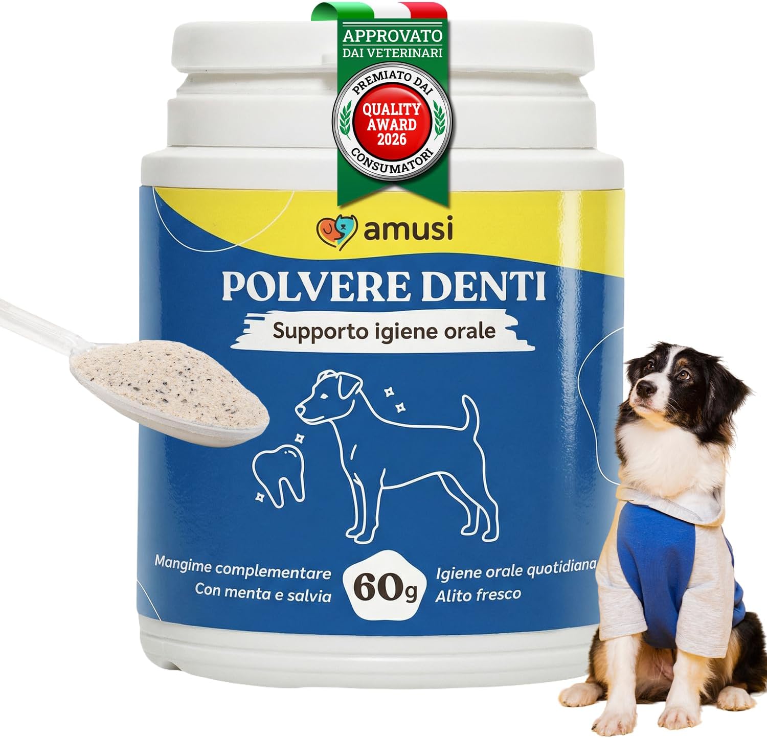 amusi Dentifricio per cani in polvere è un mangime complementare pensato per la pulizia quotidiana di denti e alito del cane, senza dover prendere in mano lo spazzolino. L’idea di base è semplice: la polvere si aggiunge al cibo e, secondo quanto dichiarato dal produttore, contribuisce a mantenere la bocca più pulita nell’uso di routine.