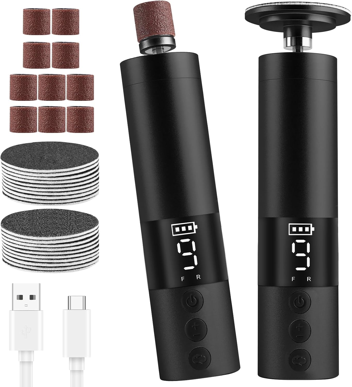 Il set comprende la macchina elettrica, due testine di levigatura in acciaio inox, 20 fogli abrasivi autoadesivi distribuiti in grana grossa e fine, 10 anelli per lucidatura e un cavo di ricarica USB-C. La dotazione rende il prodotto pronto all'uso appena tolto dalla scatola, utile per chi preferisce soluzioni complete e pratiche. 🎁