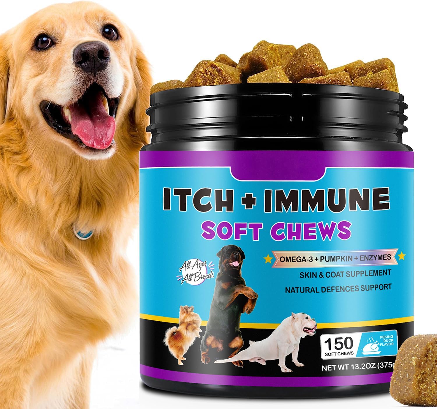 Bieyoc Sollievo dal prurito cutaneo per cani con quercetina, bromelina e curcuma (150 pezzi, gusto anatra)