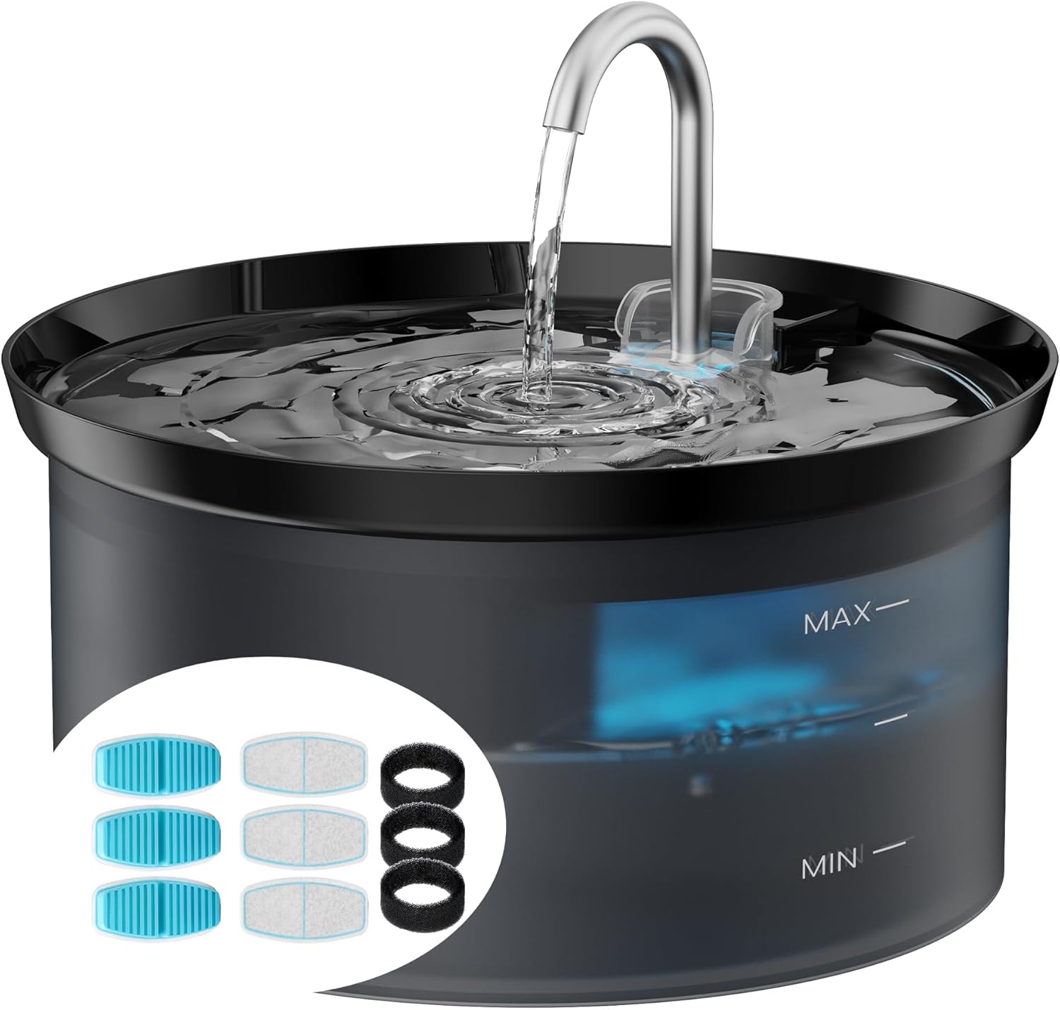 La parte interessante è che non è solo “un beverino”: nel nome compaiono già 6 filtri e 3 spugne, pensati per lavorare sull’acqua e ridurre impurità. In più, si parla di pompa ultra silenziosa e di funzione anti-sputtering, quindi l’obiettivo dichiarato è anche evitare schizzi in giro e rumori fastidiosi.