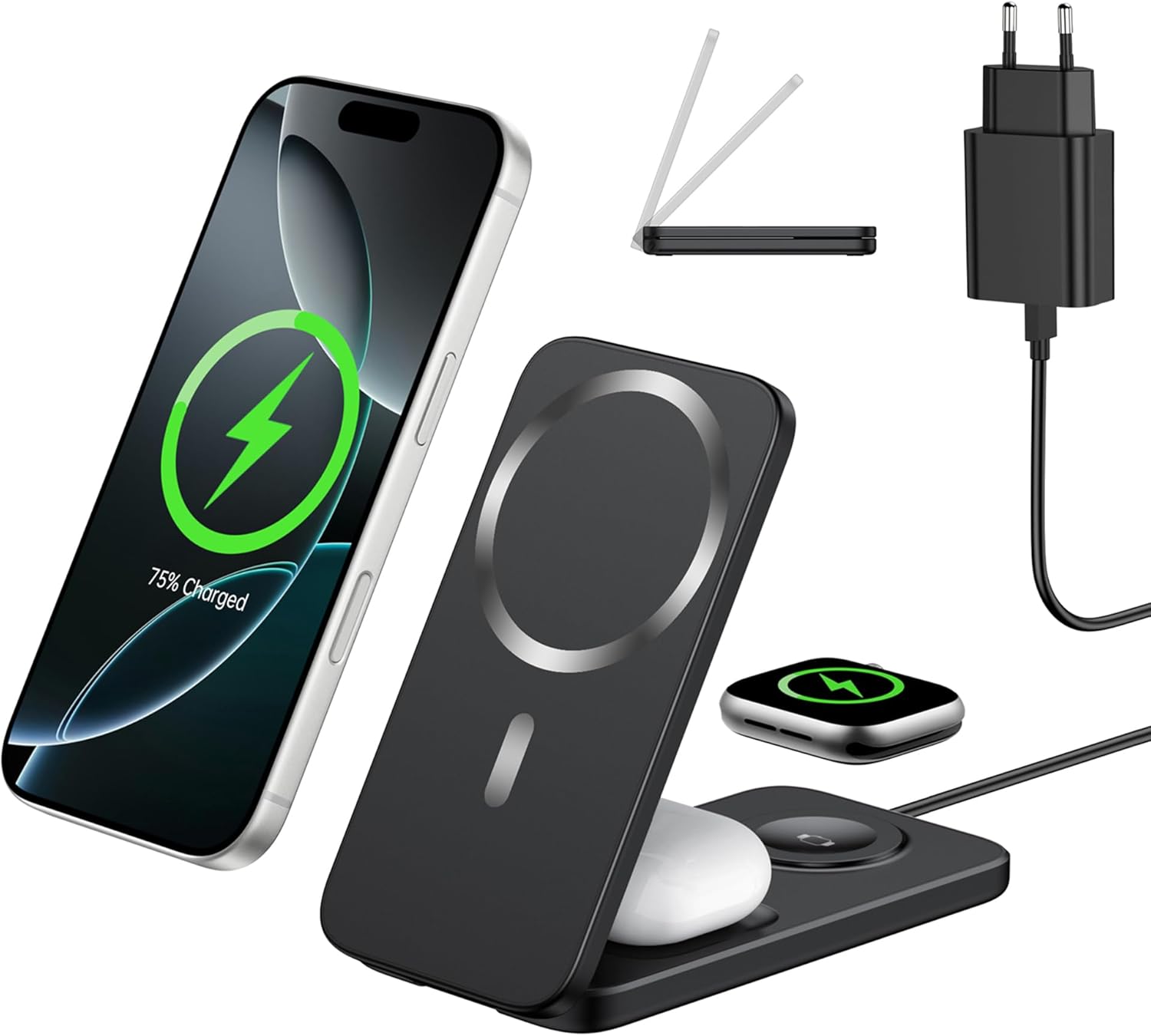 Se vuoi ricaricare più dispositivi Apple in modo ordinato (e senza avere mezzo groviglio di cavi sulla scrivania), questo caricatore wireless 3 in 1 compatibile MagSafe punta dritto al tuo problema quotidiano. L’idea è semplice: una sola stazione per iPhone, Apple Watch e AirPods, con allineamento magnetico pensato per tenere lo smartphone stabile durante la ricarica.
