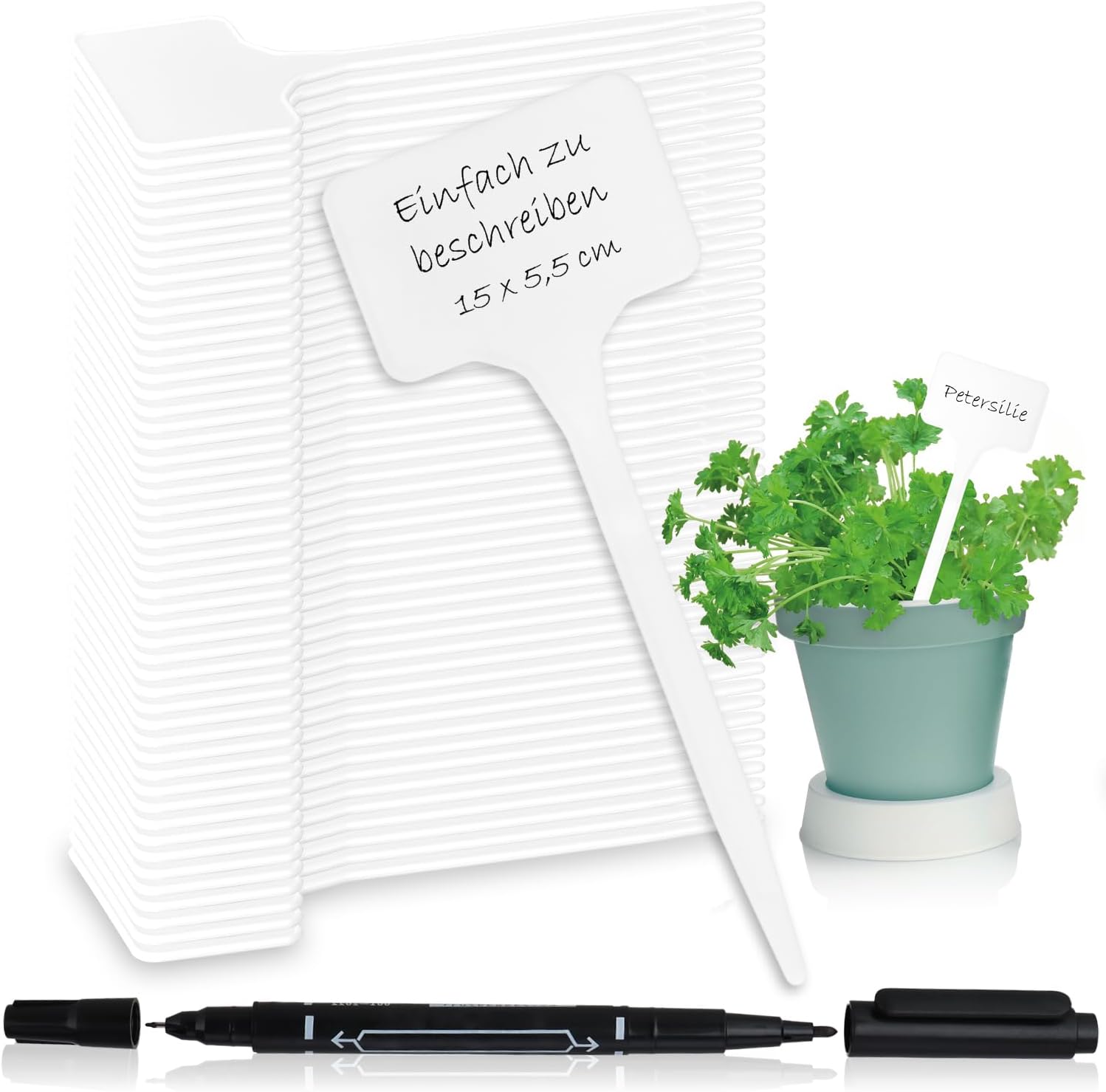 50x Etichette per Piante, 1x Pennarello a doppia punta. Materiale: plastica, Colore etichette: bianco, Colore pennarello: nero. Dimensioni etichette: circa 15 x 5,5 cm, area scrittura: circa 5,3 x 3,3 cm.