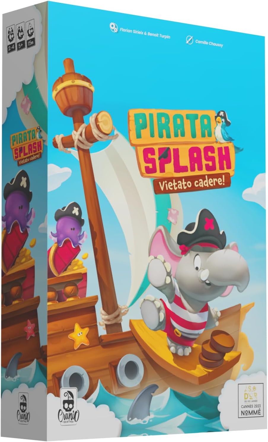 Pirata Splash di Cranio Creations è un gioco da tavolo pensato per farvi calare (letteralmente) nel ruolo di una ciurma di elefanti pirati. L’idea di base è semplice e divertente: restare l’ultimo a bordo della nave mentre gli altri cercano di scoprirti o, al contrario, di non farsi scoprire. Se qualcuno ti “becca”, può succedere che finisca il tempo nel modo peggiore… e nel gioco questo significa anche essere spinti in mare.