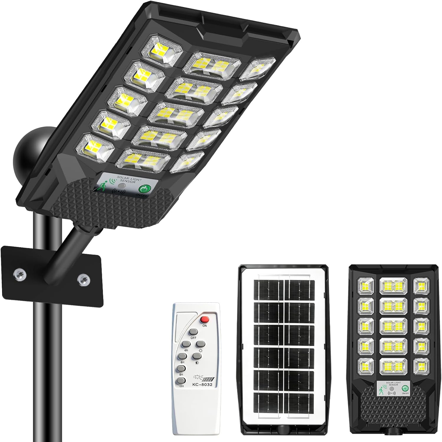 La lampada offre illuminazione a 320° con corpo tripla-luce, installazione sia su palo che a parete, e comandi remoti fino a 8–10 metri. Dispone di un sensore di movimento che attiva l’alta luminosità quando qualcuno è nel campo di rilevamento e la attenua quando l’area è vuota. È presente una gestione della luce solare: dopo il tramonto si accende automaticamente, durante il giorno si ricarica e, se esposto a luce diretta sul pannello, può non spegnersi immediatamente. Due modalità di illuminazione: movimento (alta/attenuata) e pianificata (4/6/8/10 ore di alta luminosità seguite da bassa luminosità). Il telecomando permette di regolare durata, luminosità e accensione/spegnimento.