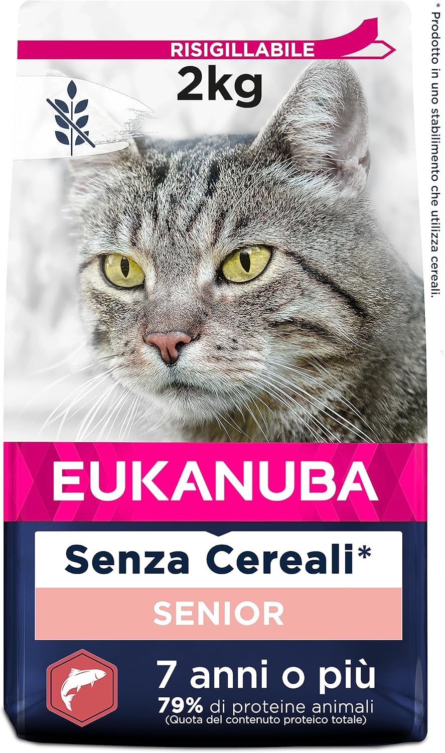 Se il tuo gatto è entrato nella fase senior, la scelta del cibo tende a diventare più “mirata” rispetto a quando era giovane. Eukanuba Grain Free cibo secco per gatti anziani con ricco di salmone (2 kg) prova a rispondere proprio a questa esigenza: un alimento secco senza cereali, pensato per sostenere funzioni essenziali, vitalità e benessere intestinale.