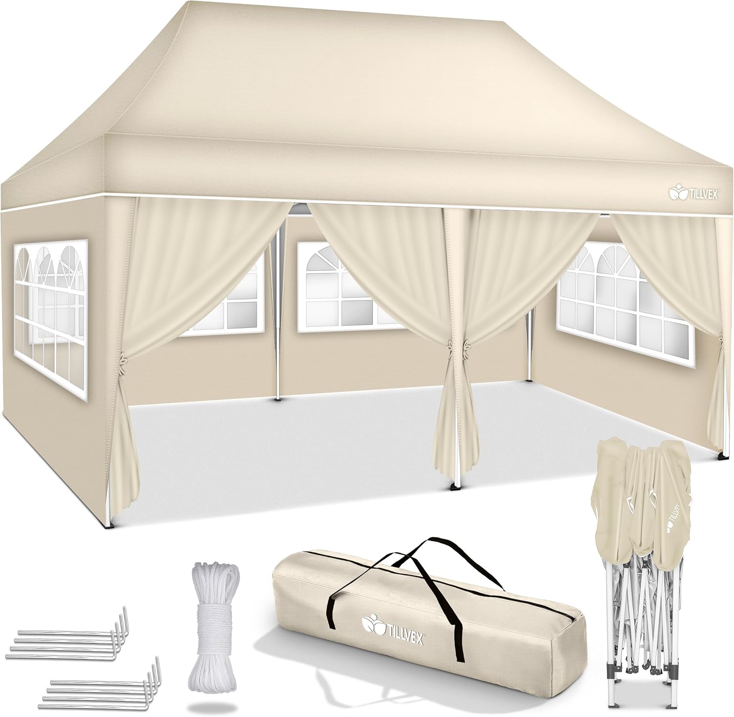 Gazebo tillvex 3x6 m pieghevole regolabile in altezza con tenda pop-up impermeabile UV 50+ e 6 pannelli laterali (beige)