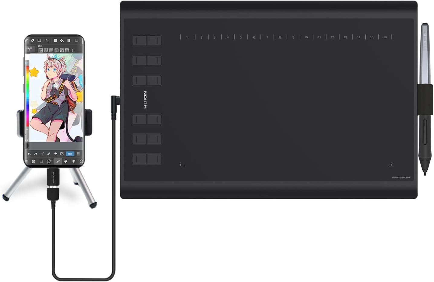La HUION H1060P è una tavoletta grafica pensata per chi cerca una superficie di lavoro ampia ma contenuta, ideale per insegnamento, lavoro online e conferenze web. La penna EMR senza batteria permette disegni prolungati senza interruzioni di ricarica, offrendo una risposta rapida e naturale. Se devi guidare presentazioni, annotare idee durante una lezione o partecipare a meeting creativi, questa tavoletta mette a disposizione una zona di disegno comoda e accessoriata.