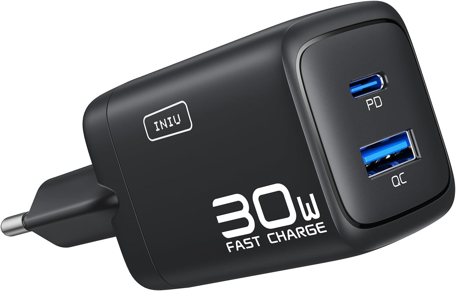 - INIU Caricatore USB‑C 30W doppio porta USB‑C e USB‑A per smartphone e tablet
