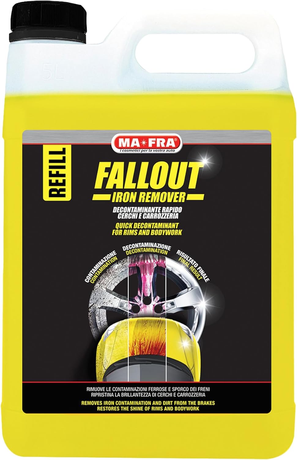 Il Fallout Iron Remover di Ma-Fra è un decontaminante rapido pensato per eliminare residui ferrosi sia sulla carrozzeria sia sui cerchi in acciaio o lega leggera. Con una confezione da 4500 ml, si propone come soluzione versatile per chi desidera rimuovere sporco ferroso in modo efficace senza danni alle superfici delicate. La formulazione innovativa trasforma e dissolve chimicamente i depositi ferrosi penetrati nella vernice, creando una soluzione viola facilmente risciacquabile.