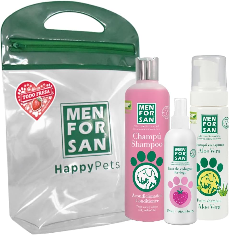 Menforsan Confezione Igiene e Bellezza per cani e gatti con fragola: shampoo + balsamo + colonia + shampoo in schiuma