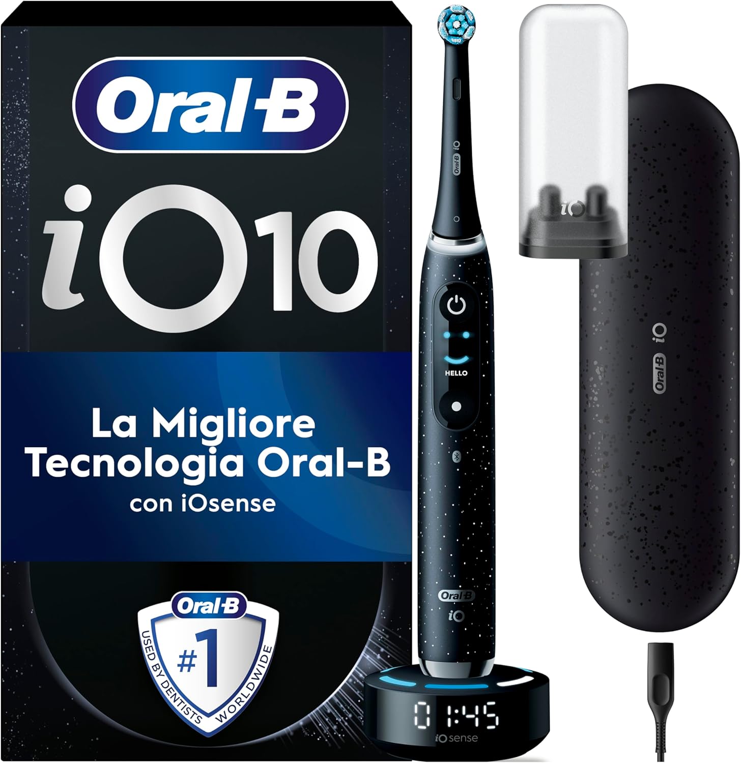 - Contenuto della confezione: 1 manico iO10 con 1 testina, 1 custodia caricabatterie da viaggio, 1 caricatore intelligente iO Sense, 1 portaricambi
