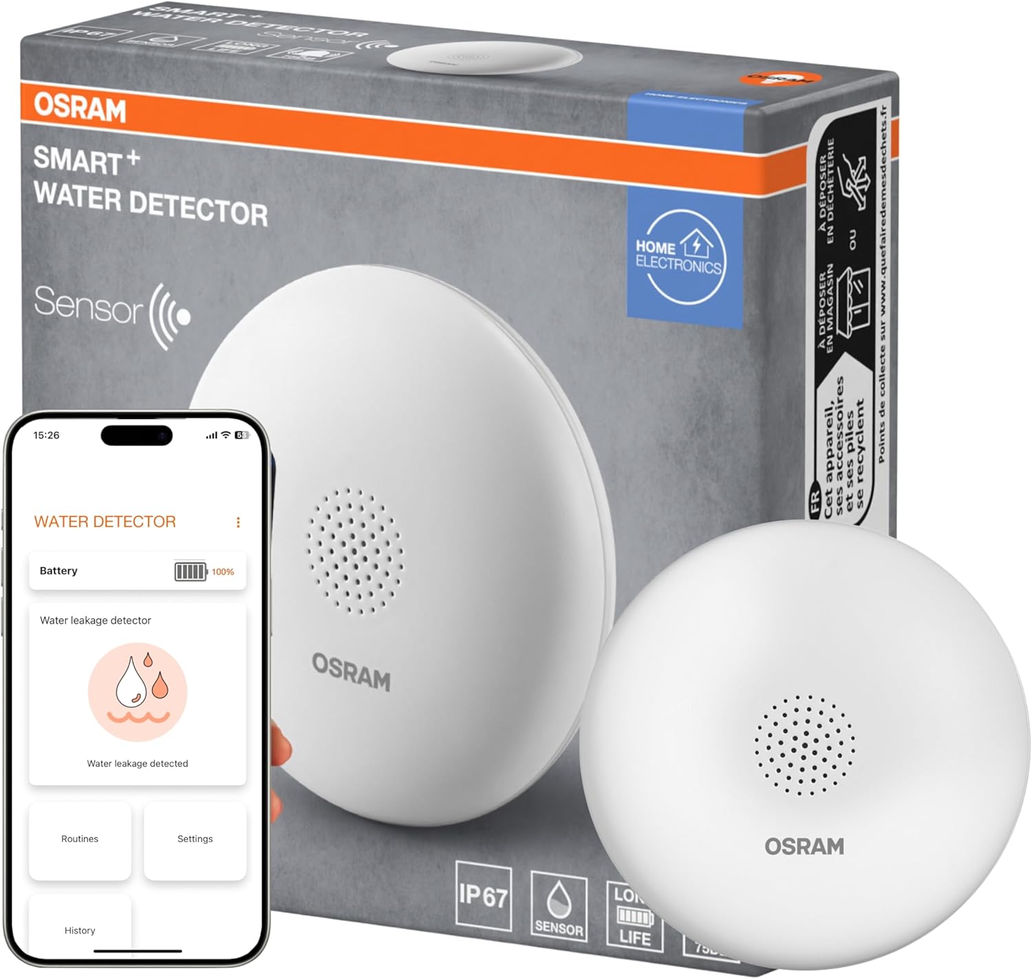 OSRAM SMART+ Rilevatore di acqua WiFi è un sensore pensato per la rilevazione precoce di perdite d’acqua in ambienti interni. In pratica, ti aiuta a non accorgerti della fuga “troppo tardi”: quando il sistema individua la presenza di acqua, attiva un allarme e invia anche una notifica sull’app.