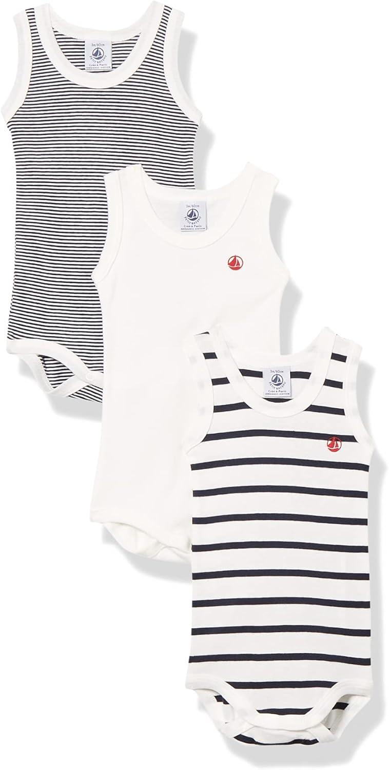 Petit Bateau A02ei body senza maniche unisex (confezione da 3) in cotone biologico per bimbi 0-24 mesi